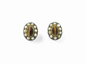 Orecchini in oro giallo e argento con quarzi occhi di tigre e microperle