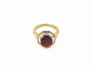 Anello a fascia in oro e argento con diamanti, rubino e smeraldo