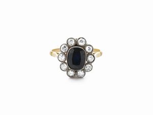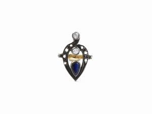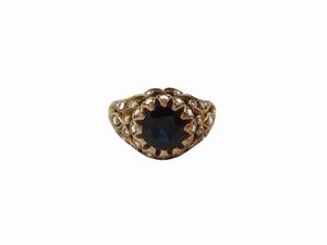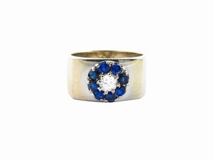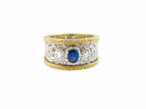 Anello a fascia in oro bianco e giallo con diamanti e zaffiro