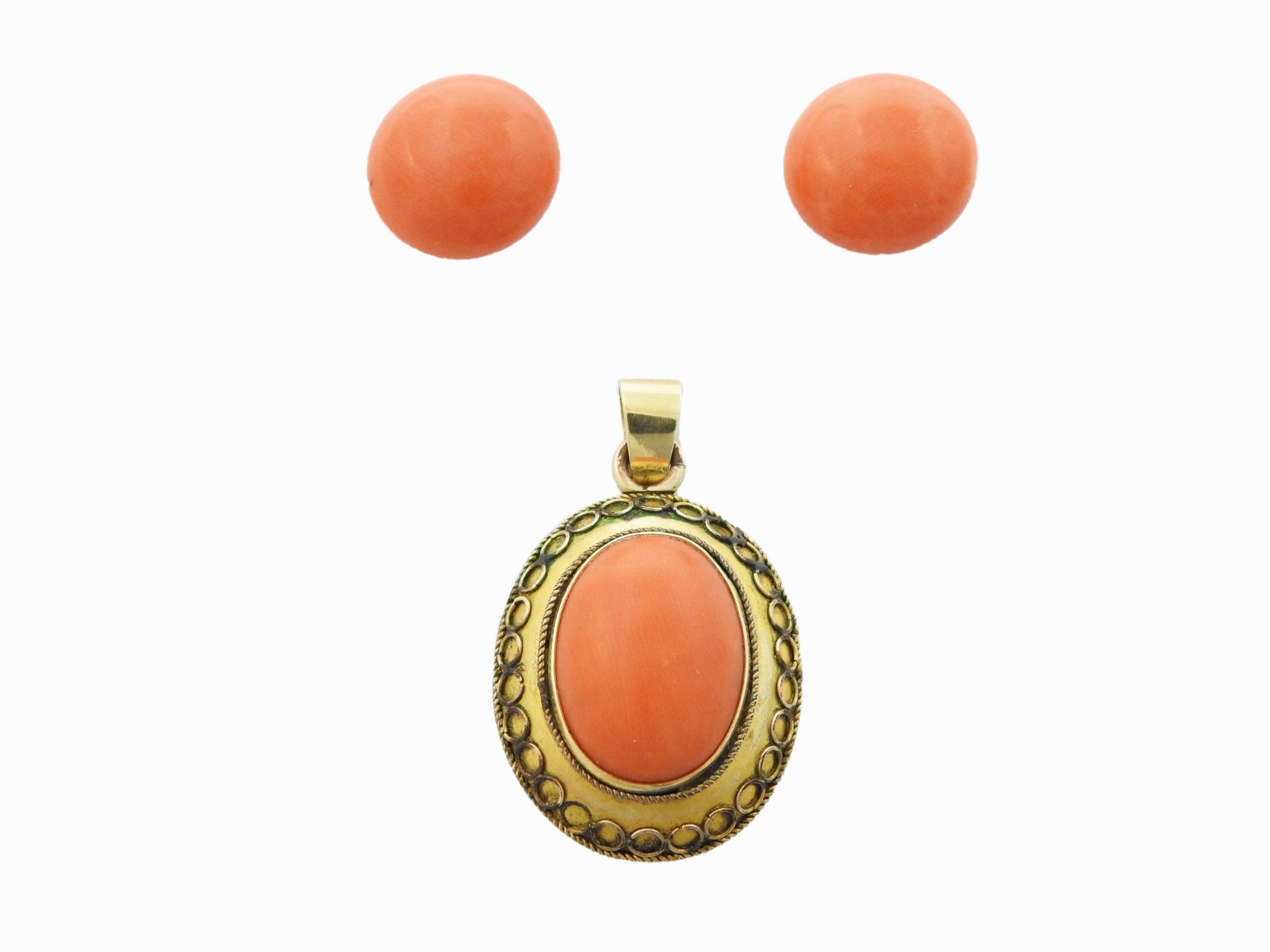 Una spilla, un pendente e due paia di orecchini in oro a vario titolo con coralli [..]