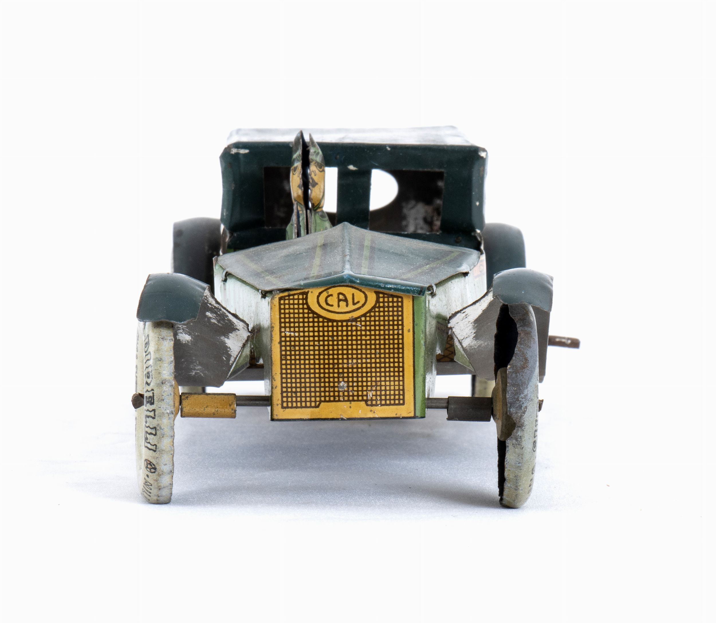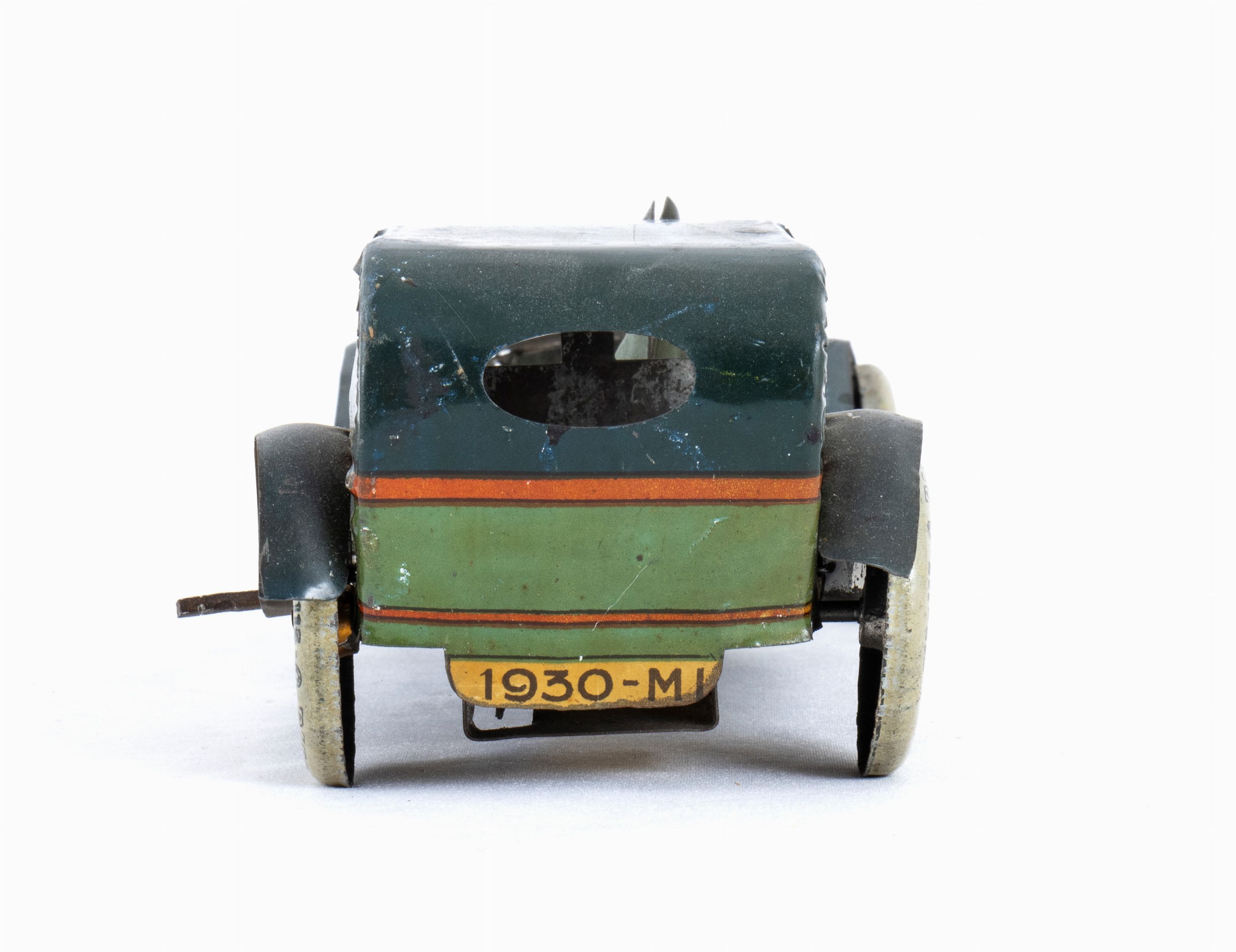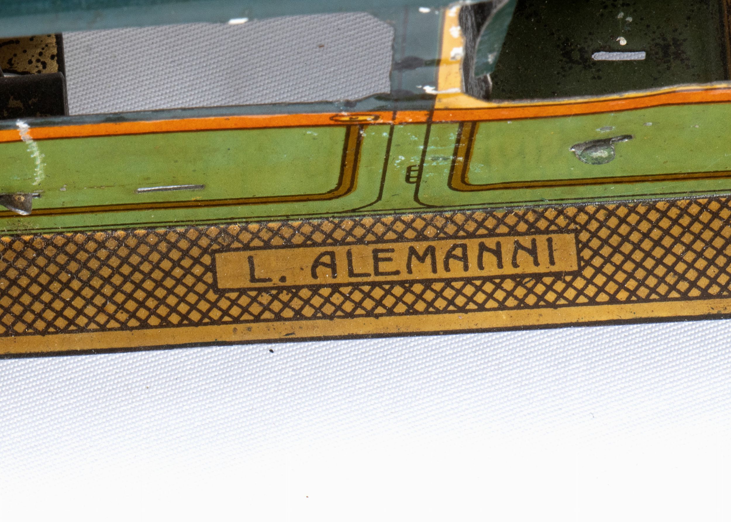 In latta litografata, meccanismo di carica a molla, con autista esterno, targa 1930-MI , marcata L.ALEMANNI sui predellini, pneumatici PIRELLI SUPERFLEX. Anni '930