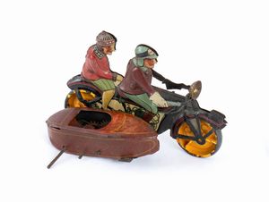 cm.15 Moto con sidecar in latta litografata, da riassemblare e completare (mancano le ruote ed il passeggero del [..]