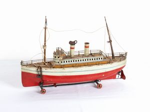Latta, 35x30 1900s Carette George, nave passeggeri in latta litografata e dipinta, due fumaioli, due alberi, [..]