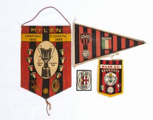 sintetico 1960-70s Lotto di quattro gadget della AC MILAN , due gagliardetti, una bandierina, una patch, in carta [..]
