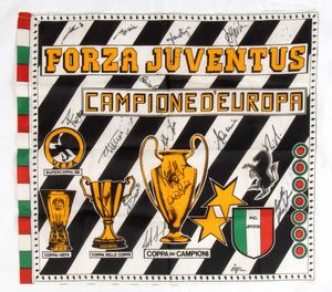 sintetico, cm.58x63 1985-86 Bandiera celebrativa della JUVENTUS F.C. per la stagione 1985-86 con autografi originali [..]