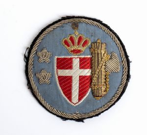 stoffa 1930s Patch tonda in cotone e canutiglia ricamata, con scudetto tricolore italiano affiancato ad un fascio [..]
