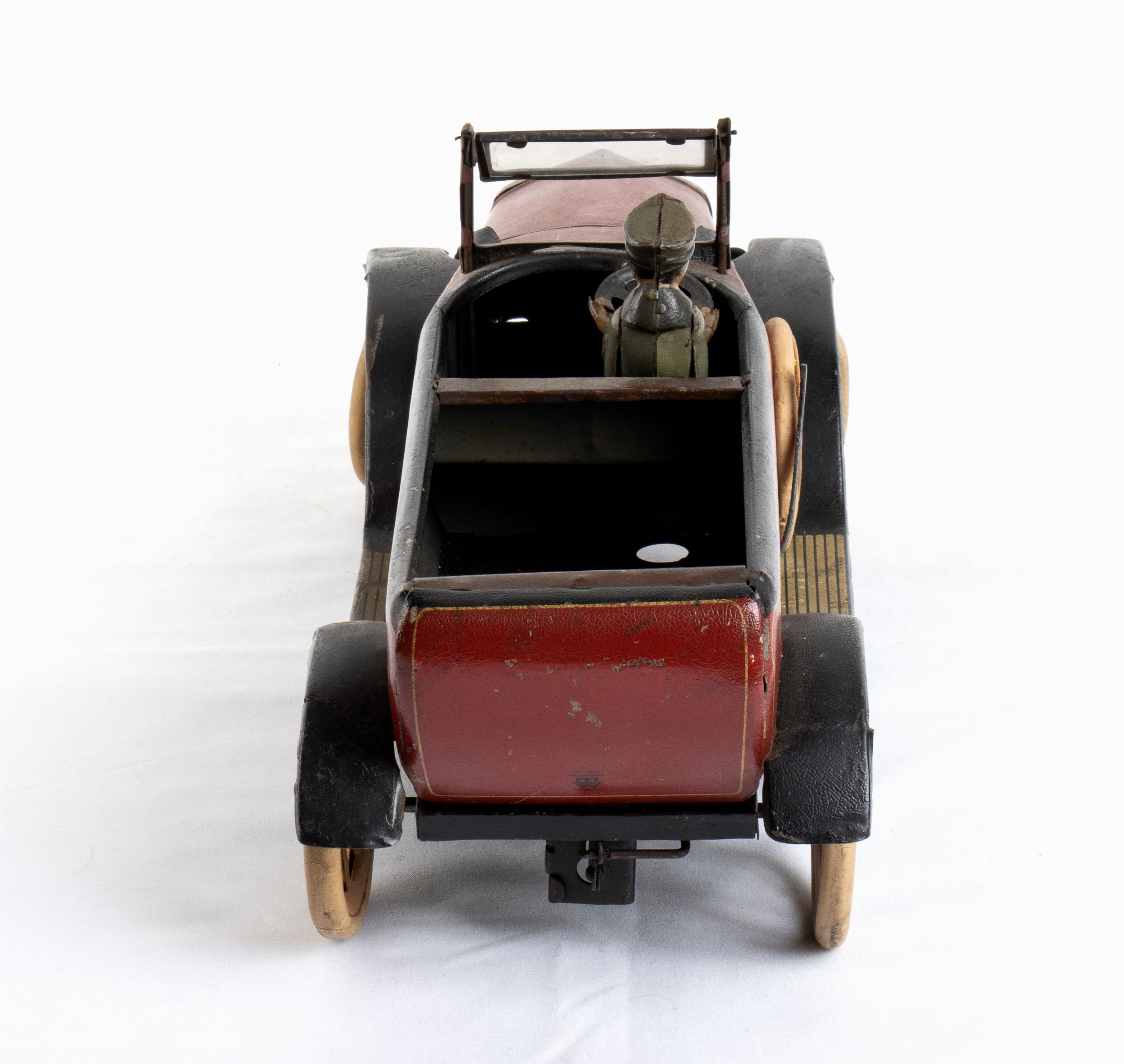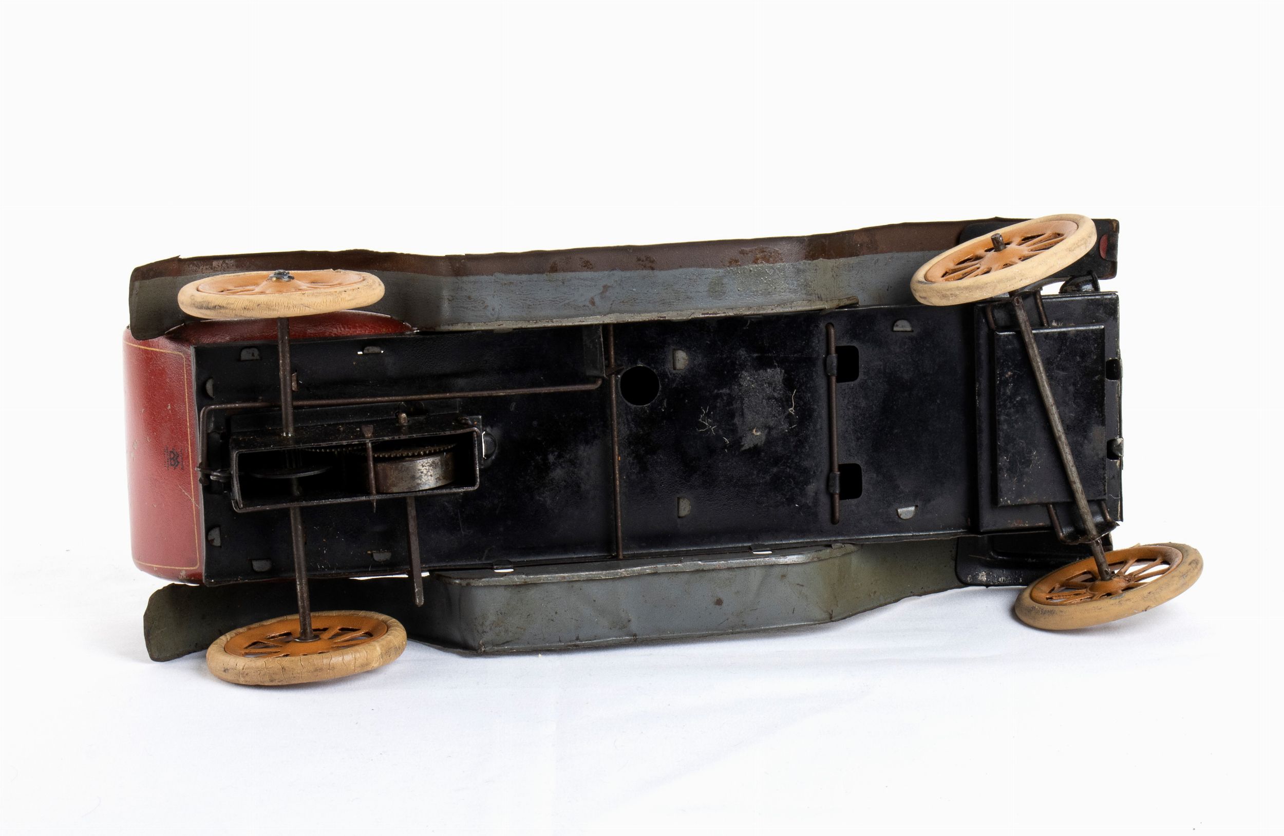 1920s Limousine aperta con autista in livrea. Latta litografata, ruote a raggi in piombo con pneumatici in gomma bianca, ruota di scorta, parabrezza inclinabile, leva freno portiera laterale esterna. Calandra in metallo cromato con dicitura BING , ruote sterzanti. Made in Germany, BING (GBN Gebruder Bing Nuremberg). Meccanismo di carica a molla, funzionante. In buone condizioni, con patina e segni del tempo
