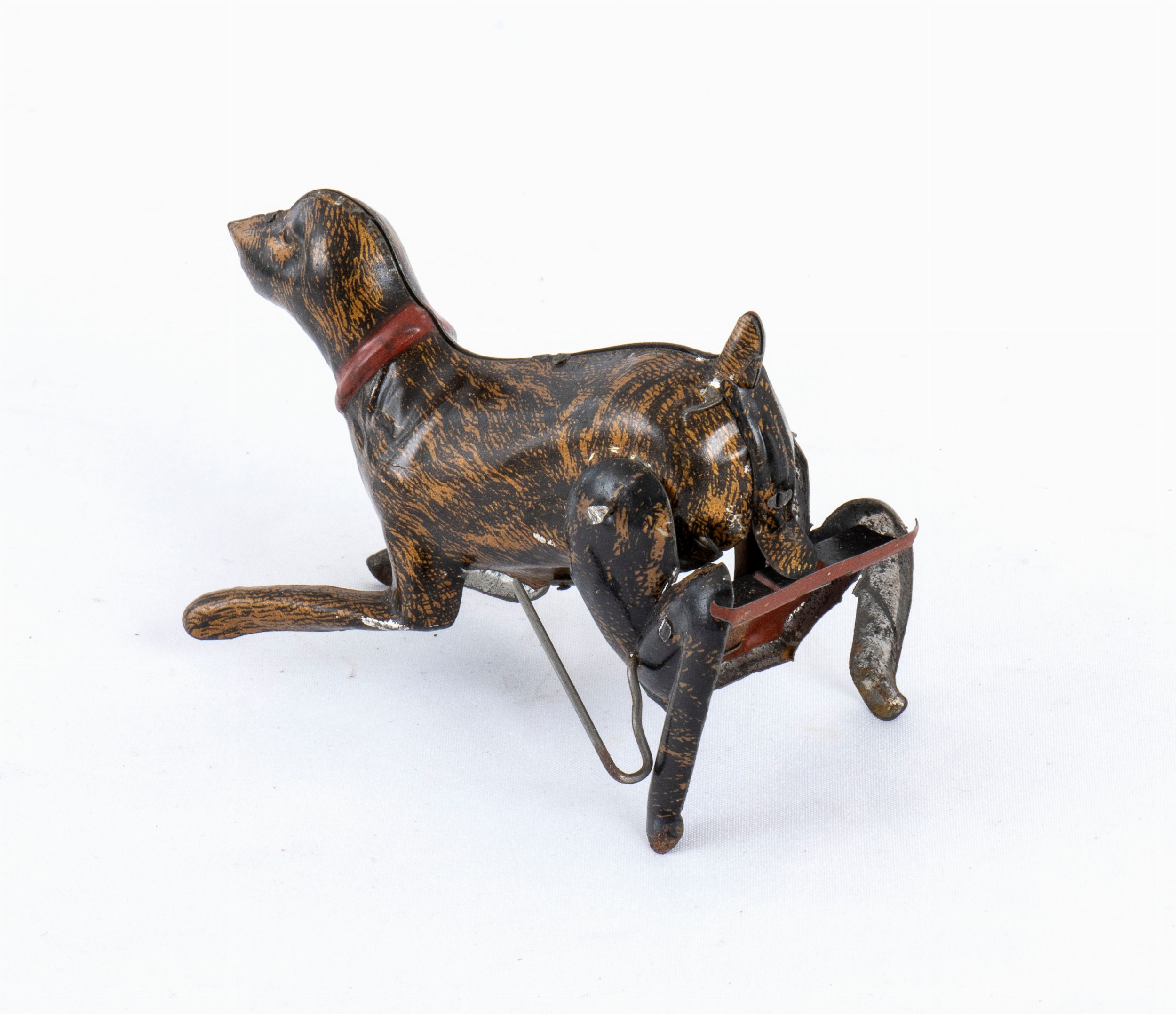 Cane in latta litografata, con meccanismo a scatto che lo fa saltare sulle zampe posteriori. In scatola originale. Made in Italy, non marcato. Anni '920