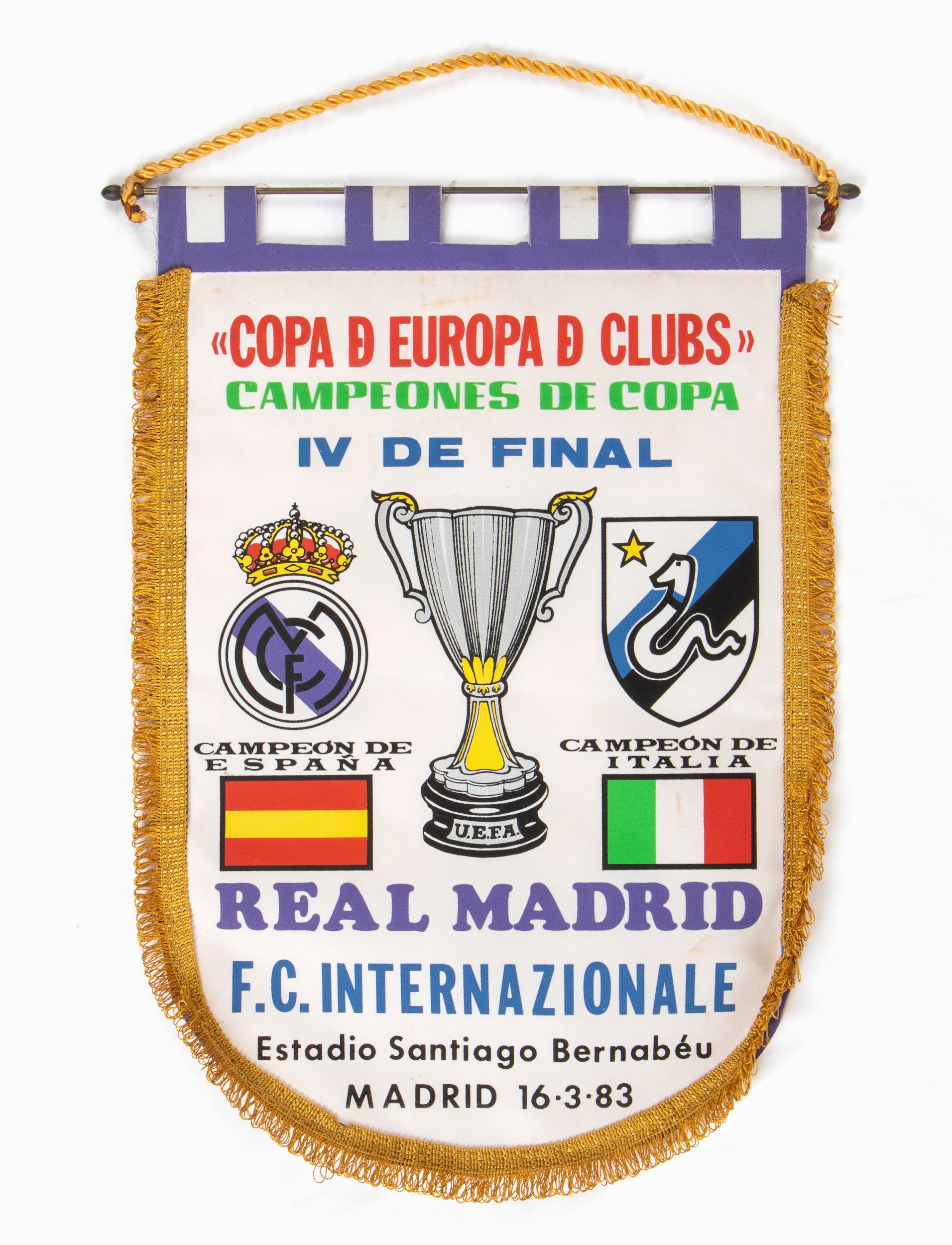 sintetico, cm.42x29 1983 Celebrativo della XXIII Edizione della Coppa delle Coppe del 1982-83, Quarti di Finale, squadre Real Madrid - Inter, per l'inconto del 16/3/1983 al Santiago Bernabeu. In materiale sintetico, a stampa, frangia sintetica applicata, asta in metallo di supporto. In ottime condizioni