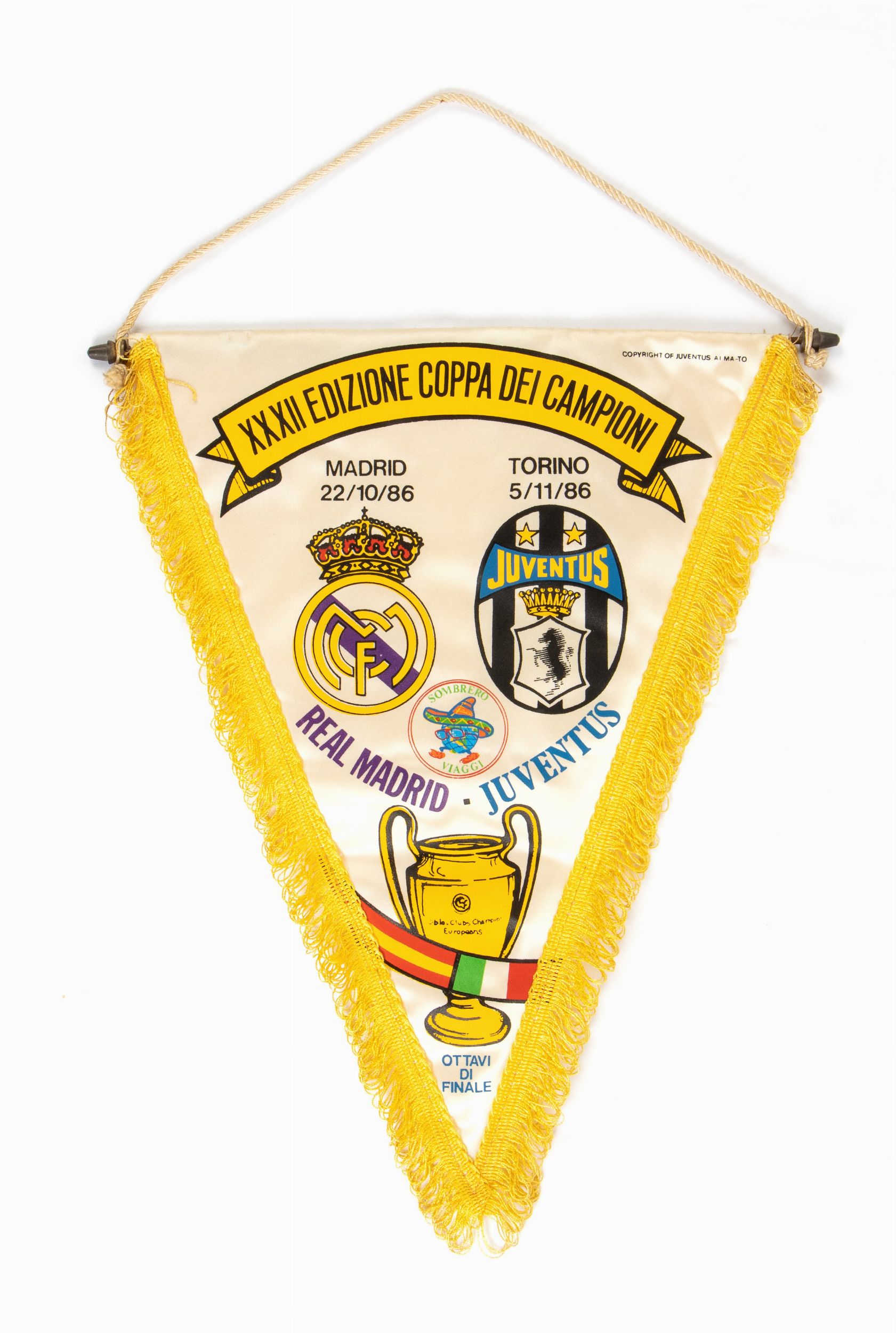 cm.37x27 1986 Celebrativo della XXXII Edizione della Coppa dei Campioni, Ottavi di Finale, squadre Real Madrid - Juventus, per gli incontri del 22/10/1986 e 5/11/1986. Logo Sombrero Viaggi. In materiale sintetico, a stampa, frangia sintetica applicata, asta in metallo di supporto. Marcato COPYRIGHT OF JUVENTUS AI MA-TO