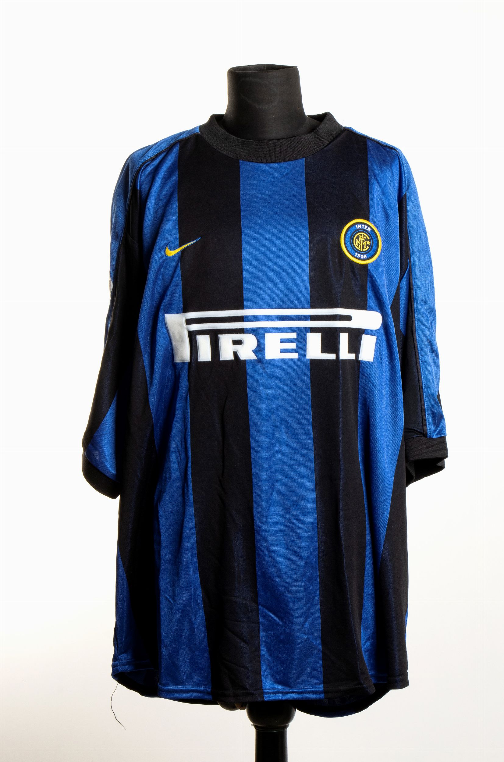 Jersey '90s Maglia NIKE nerazzurra numero 32 con autografo di Christian Vieri. Maglia INTER 1908 , maniche corte. Sul fronte patch tonda senza stella applicata al petto a sinistra, logo PIRELLI bianco applicato. Manica destra toppa LEGA CALCIO. Sul retro autografo originale scritto di pugno da Vieri con pennarello nero, sotto il numero di gioco. Maglia da store. Ottime condizioni
