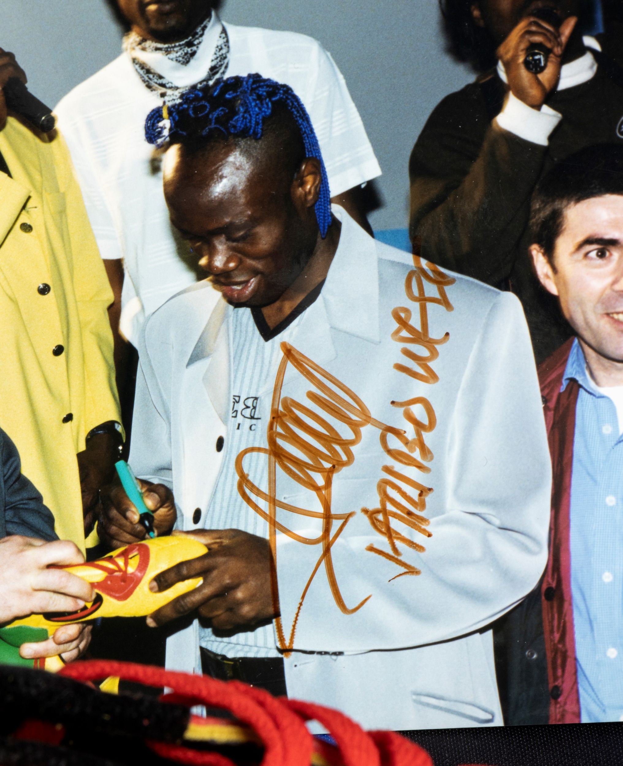 jersey '90s Maglia NIKE nerazzurra a maniche corte numero 16 WEST , da store, e paio di scarpini da gioco gialli. Maglia INTER 1908 , con patch tonda con stella, applicata al petto a sinistra, logo PIRELLI bianco applicato. Maglia da store. Scarpini gialli con autografo di TARIBO WEST originale scritto di pugno a pennarello. In aggiunta una fotografia che ritrae Taribo West intento alla firma sugli scarpini in oggetto. Ottime condizioni