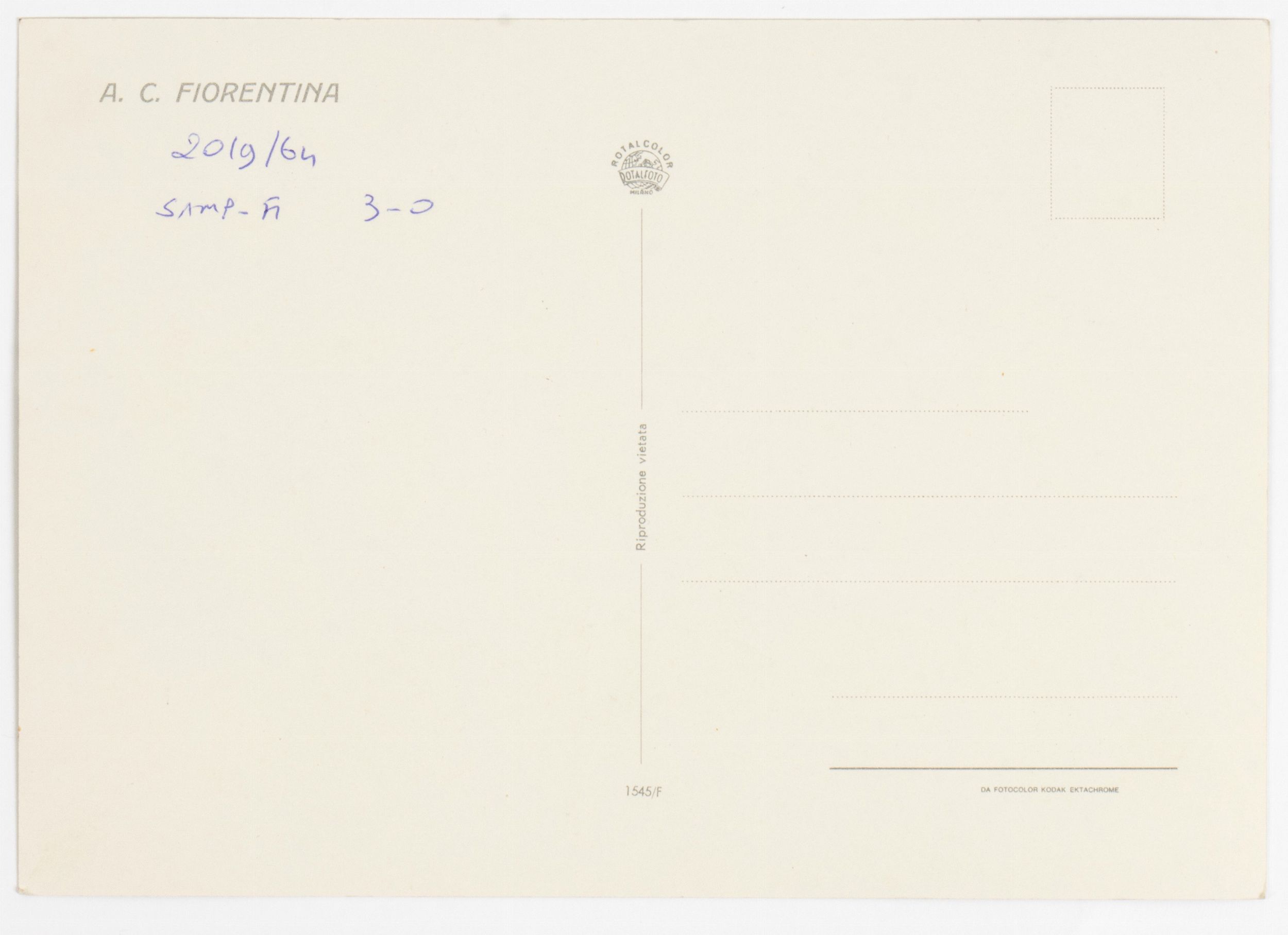 1964 Fotografia di squadra schierata della FIORENTINA con autografi. Foto cartolina a colori, ufficiale della squadra, presa all'interno dello stadio Marassi in occasione dell'incontro Sampdoria-Fiorentina del 20 Settembre 1964. Autografi originali, scritti di pugno dai calciatori viola tra i quali si riconoscono Albertosi, Pirovano, Guarnacci, Marchesi, Enzo Robotti, Kurt Hamrin. Fotografia della collezione personale del mister Rino Marchesi