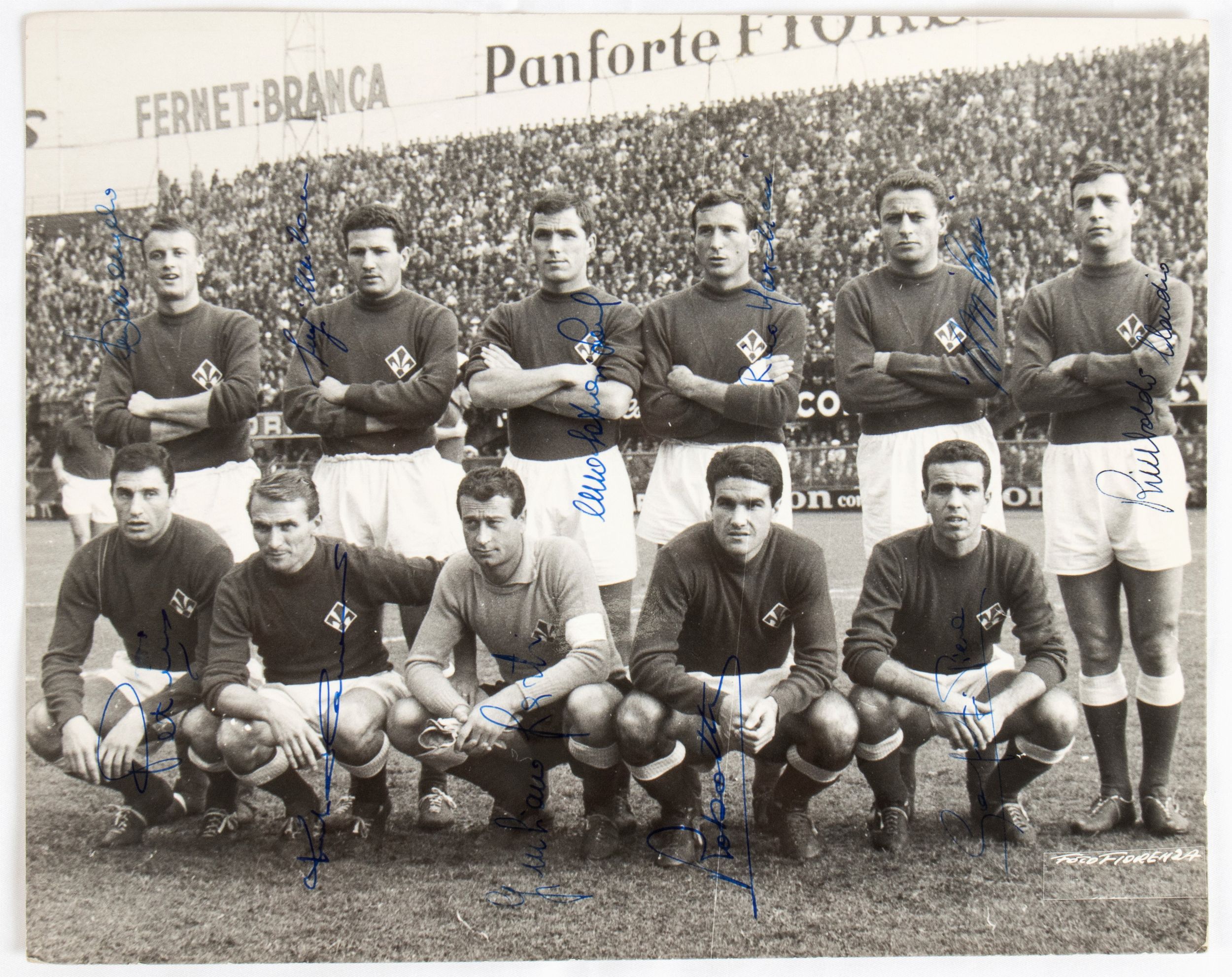 1961 Fotografia b/n di squadra schierata della FIORENTINA , stagione 1961-62, con autografi. Fotografo Fiorenza. Autografi originali, scritti di pugno dai calciatori viola tra i quali si riconoscono Lucio dell'Angelo, Luigi Milan, Saul Malatrasi, Rino Marchesi, Aurelio Milani, Claudio Rimbaldo, Gianfranco Petris, Giuliano Sarti, Enzo Robotti. Fotografia della collezione personale del mister Rino Marchesi