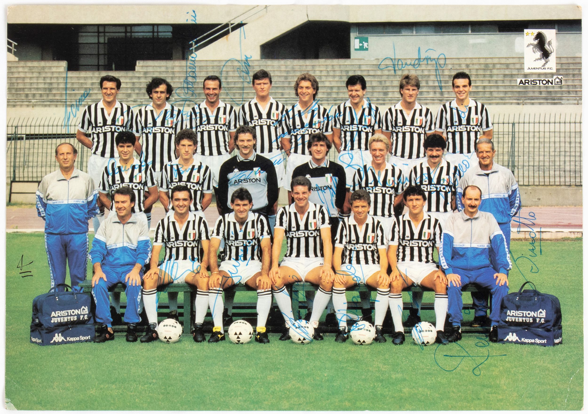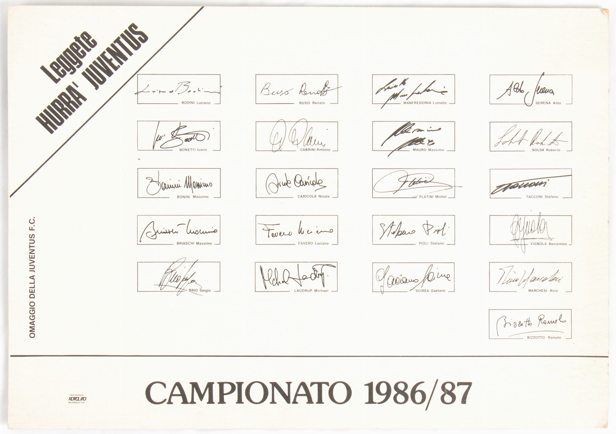 1986 Fotografia a colori della JUVENTUS Football Club, della stagione 1986-87. Ci sono 21 autografi sul fronte della foto, originali scritti di pugno dai calciatori e parte dello staff. Al retro abbiamo la riproduzione stampata delle firme, la foto è su cartoncino stampato da HURRA' JUVENTUS periodico sportivo bianconero. Le firme autografe sono di Gaetano Scirea, Michel Platini, Antonio Cabrini, Serena, Manfredonia, Soldà , Laudrup, Pioli, Caricola, Buso, Tacconi, Bodini, Bonini, Favero, Mauro, Briaschi, Brio, Vignola, Bonetti, Bizzotto (allenatore in seconda). La foto proviene dalla collezione personale del mister Rino Marchesi