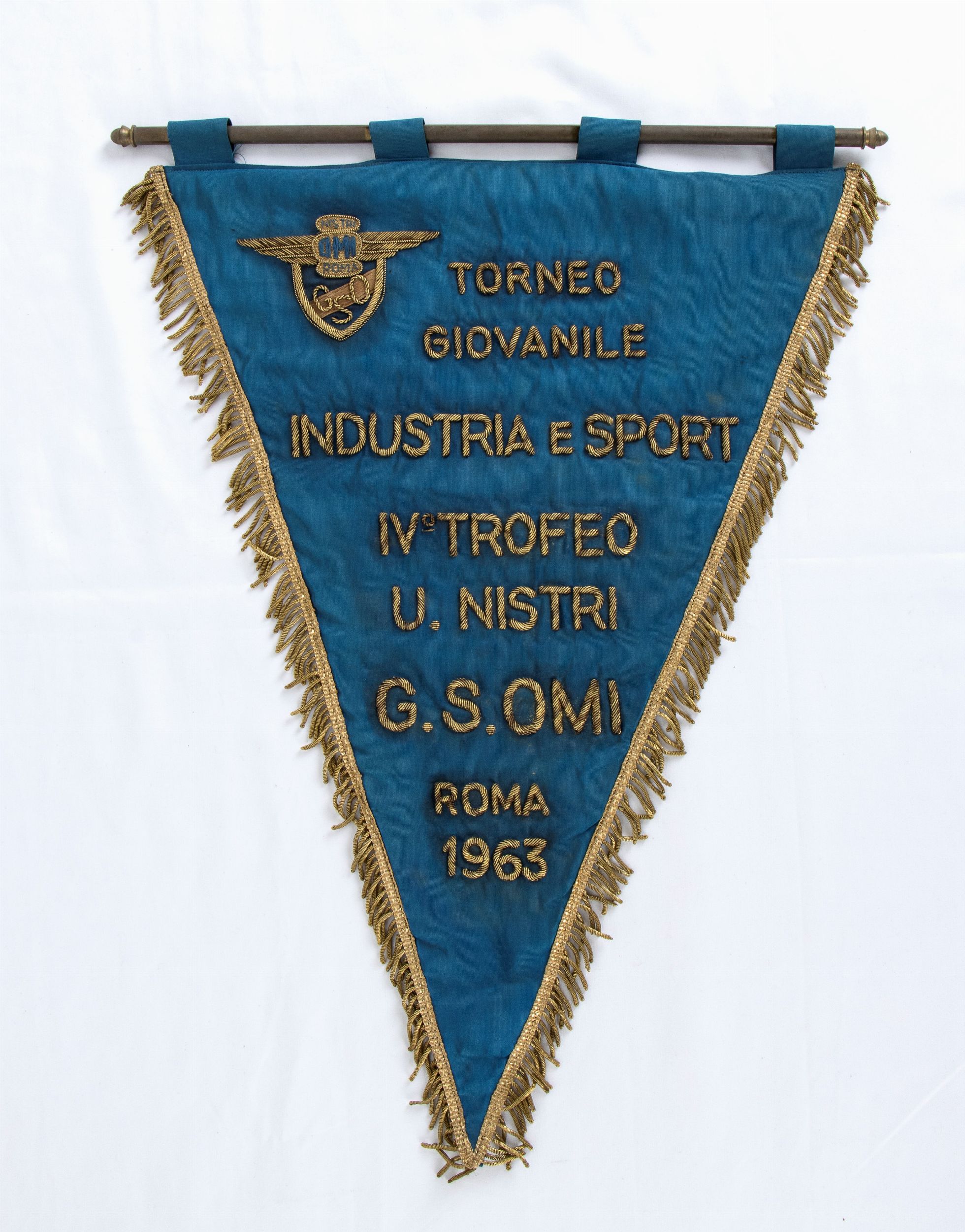 cm.50 1963 Gagliardetto ricamato per Torneo Giovanile del IV Trofeo Nistri del Gruppo Sportivo OMI. Roma 1963. Dedicato al fondatore dell' Ottica Meccanica Italiana, il torneo vedeva anche la partecipazione di squadre come Roma e Lazio. Ricami in canutiglia dorata su sfondo azzurro, al retro il tricolore italiano. In ottime condizioni, completo di asta in metallo