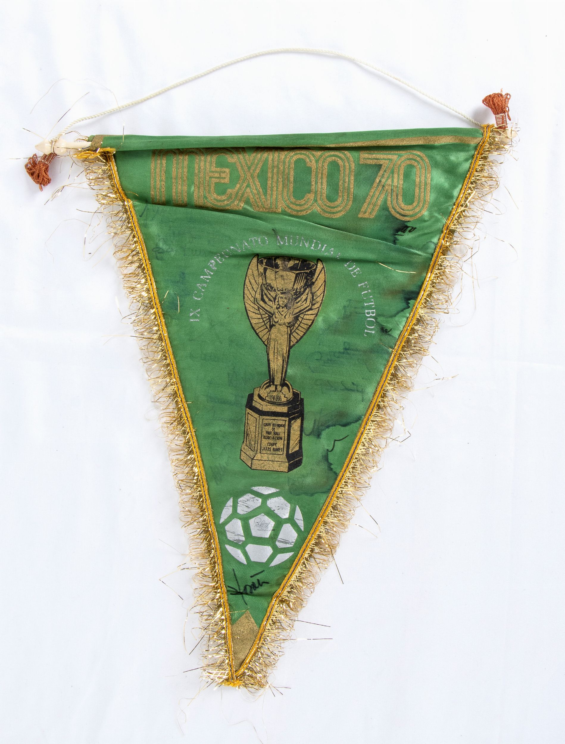 sintetico, cm.35 1970 Gagliardetto originale per i mondiali di calcio di Mexico 70 con autografi dei calciatori italiani. Immagine della Coppa Rimet e la scritta IX CAMPEONATO MUNDIAL DE FUTBOL. Gli autografi sono originali, scritti di pugno dai calciatori della nazionale italiana. Si riconoscono De Sisti, Rivera, ed altri. Completo di asta. In condizioni mediocri, le firme sono fortemente sbiadite