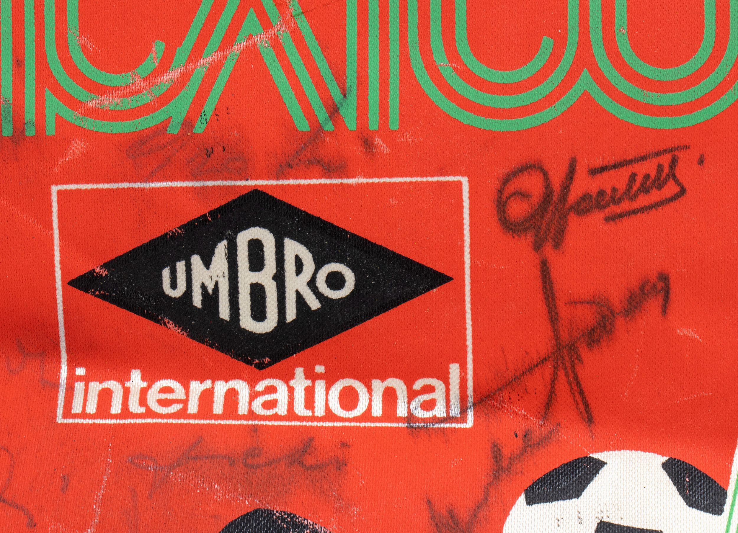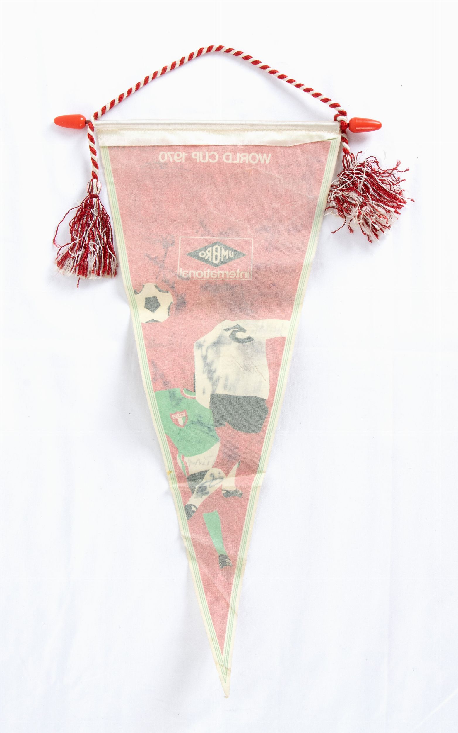 sintetico, cm.50 1970 Gagliardetto originale per i mondiali di calcio di Mexico 70 con autografi dei calciatori italiani. Immagine di calciatori in azione e la scritta WORLD CUP 1970 MEXICO con lo sponsor UMBRO INTERNATIONAL. Gli autografi sono originali, scritti di pugno dai calciatori della nazionale italiana. Si riconoscono Boninsegna, De Sisti, Furino, Bertini, Gigi Riva, l'allenatore Valcareggi. Alcune firme sbiadite. Completo di asta. In discrete condizioni