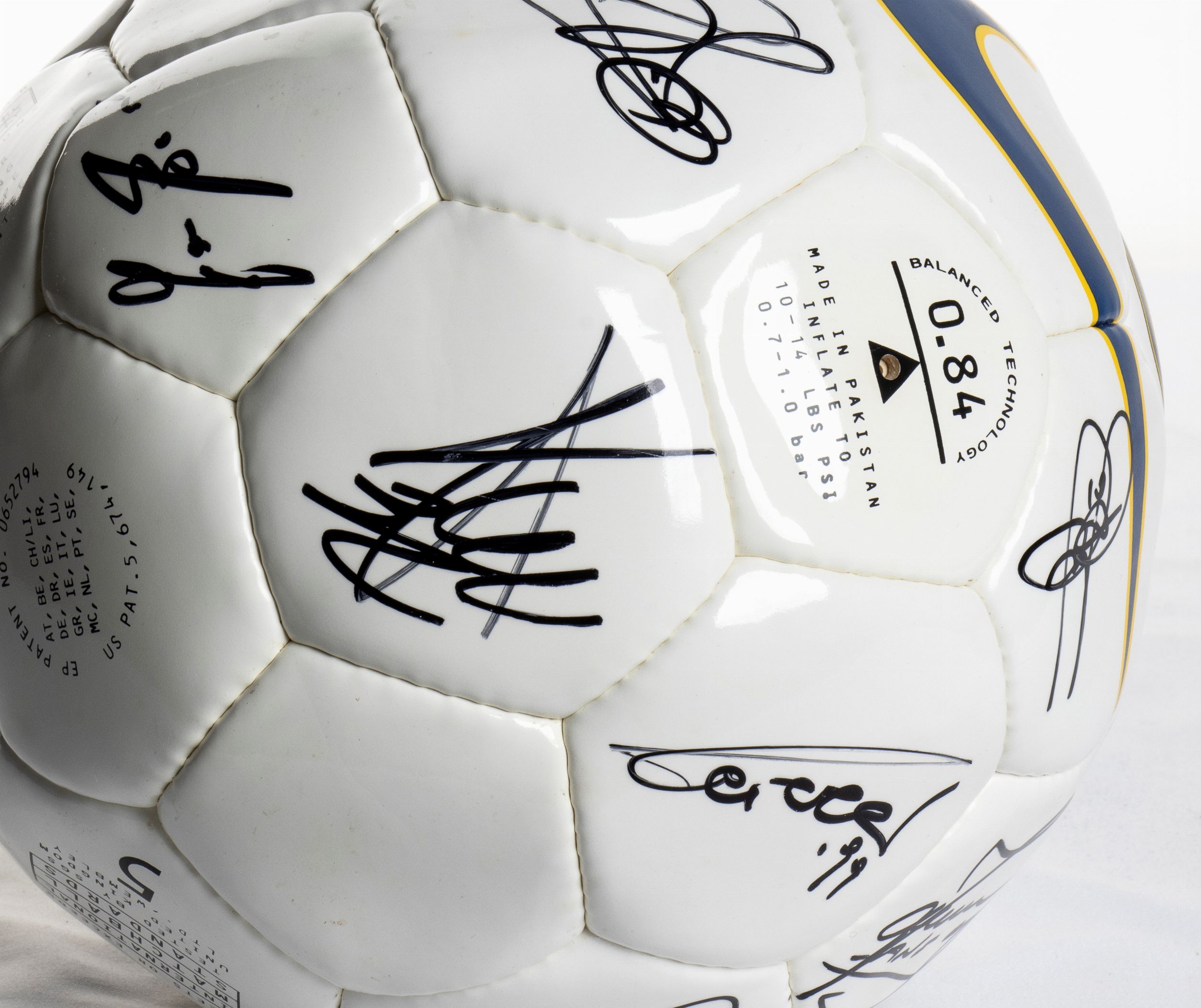 cuoio 1999 Pallone in cuoio a sezioni esagonali della FC INTERNAZIONALE , Inter di Milano, 1999-2000, autografato di pugno a pennarello nero dai calciatori della squadra , si contano 15 firme. Marcato International Matchball Standards 1999 Tested by SGS United Kingdom LTD Wembley 5 pat.0652794 - Made in Pakistan - Ottime condizioni