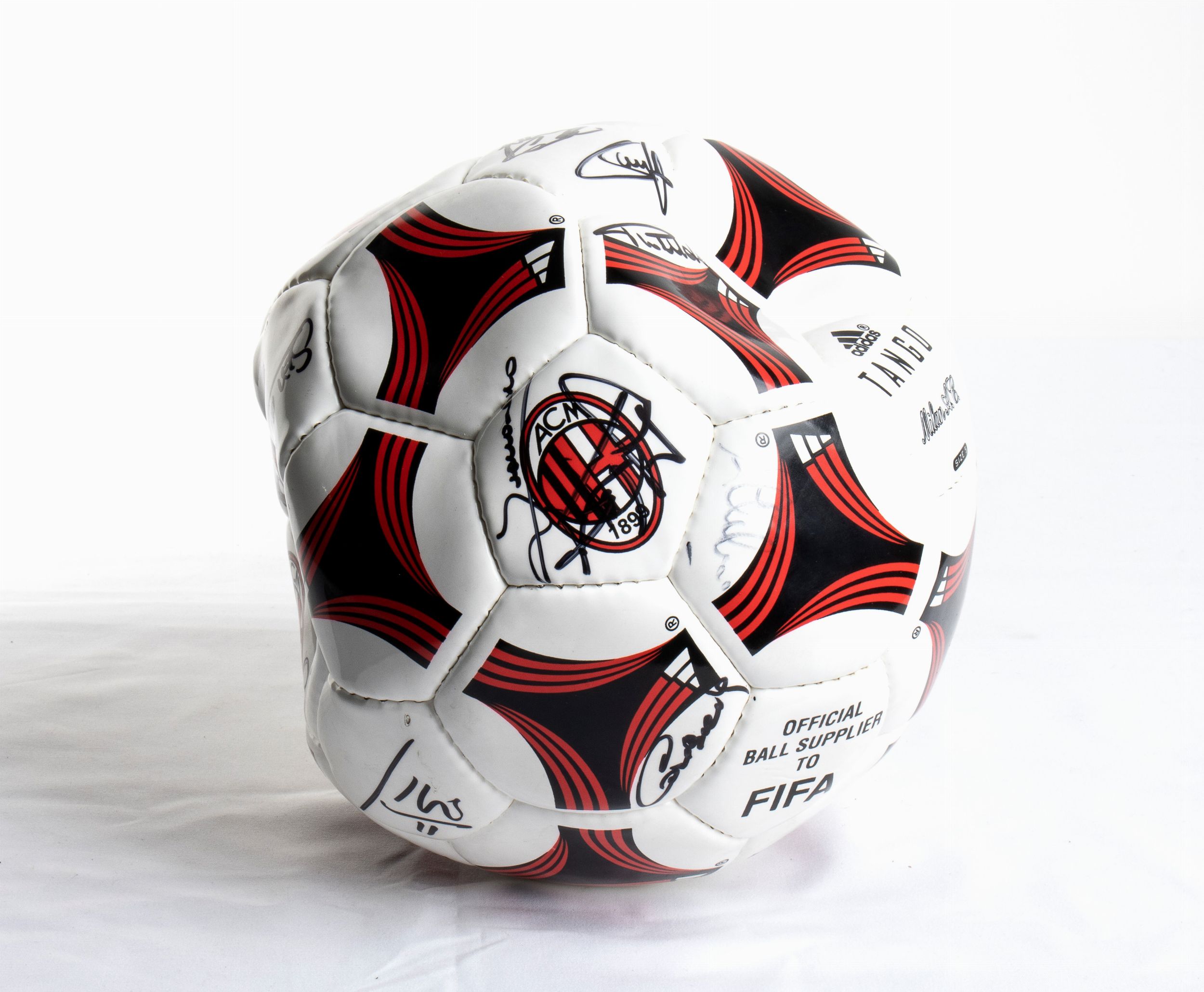 cuoio 1990s Pallone della AC MILAN con autografi dei calciatori. In cuoio a sezioni esagonali, modello Adidas Tango, Official Ball Supplier to FIFA, size 5. Le firme dei calciatori sono autentiche, eseguite di pugno con pennarello nero, si contano circa 15 autografi (riconoscibile Serginho). Anni '90. In ottime condizioni