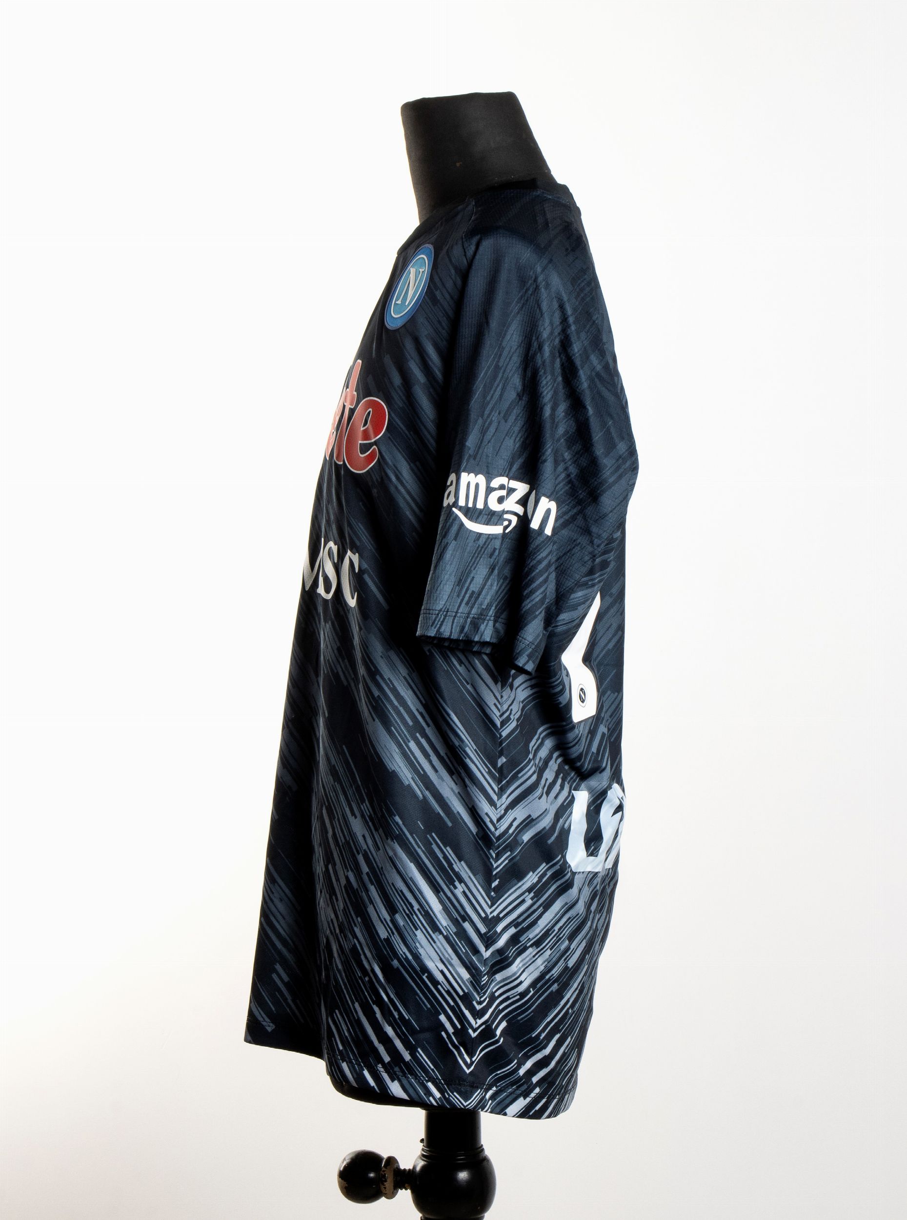 stoffa, varie 2023 Maglia di gara EA7, maniche corte, stagione 2022/23, preparata (da spogliatoio). Sul fronte marchio commerciale LETE e MSC, patch Società Sportiva Napoli N, marchio EA7. Sulla manica destra patch Serie A TIM. Sulla manica sinistra marchio AMAZON. Sulla schiena numero di gioco 77 e nome KVARATSKHELIA con sponsor UPBIT. La maglia è stata preparata per la partita Sampdoria-Napoli (0-2) del 9/1/2023. Fornita con certificato di garanzia di autenticità . Ottime condizioni