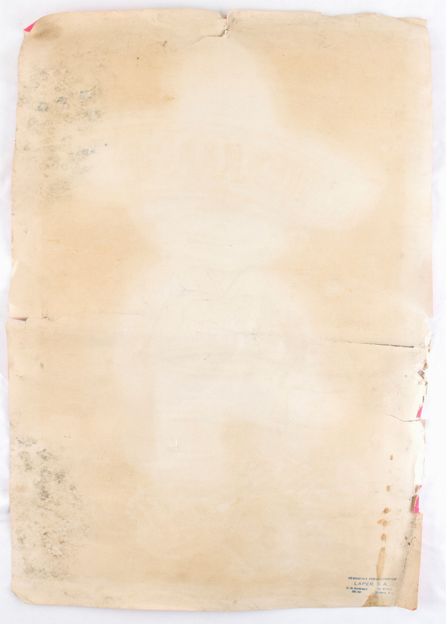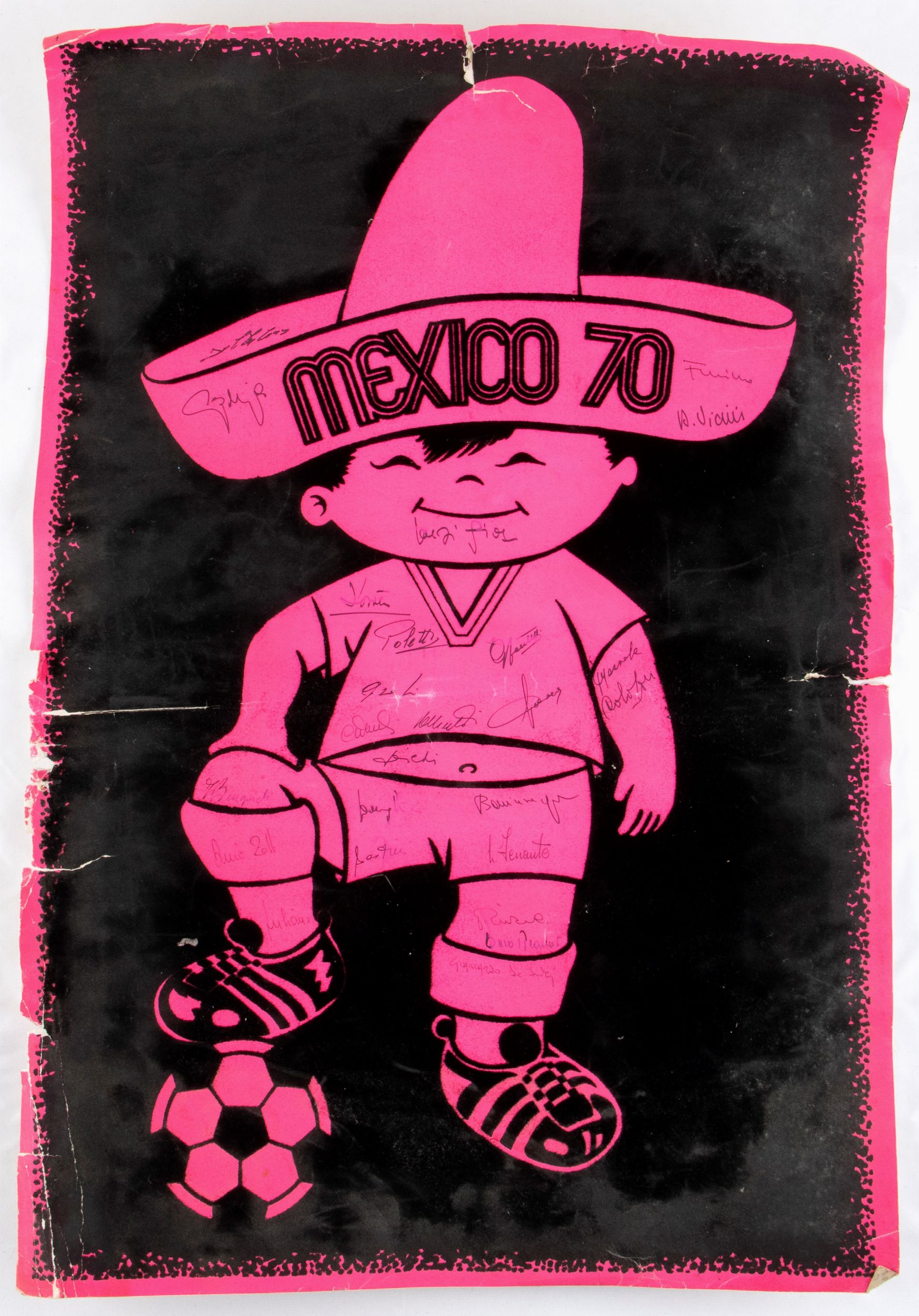1970 Poster dei Mondiali di Calcio di MEXICO 70 , carta vellutata, con la stampa della mascotte in sombrero, autografato dai calciatori della nazionale italiana. Firme originali scritte di pugno, ad inchiostro, si riconoscono De Sisti, Juliano, Zoff, Burgnich, Boninsegna, Furino , Vicini. Marcato LAPER.S.A. Condizioni mediocri, strappi vari, tracce di umido al retro