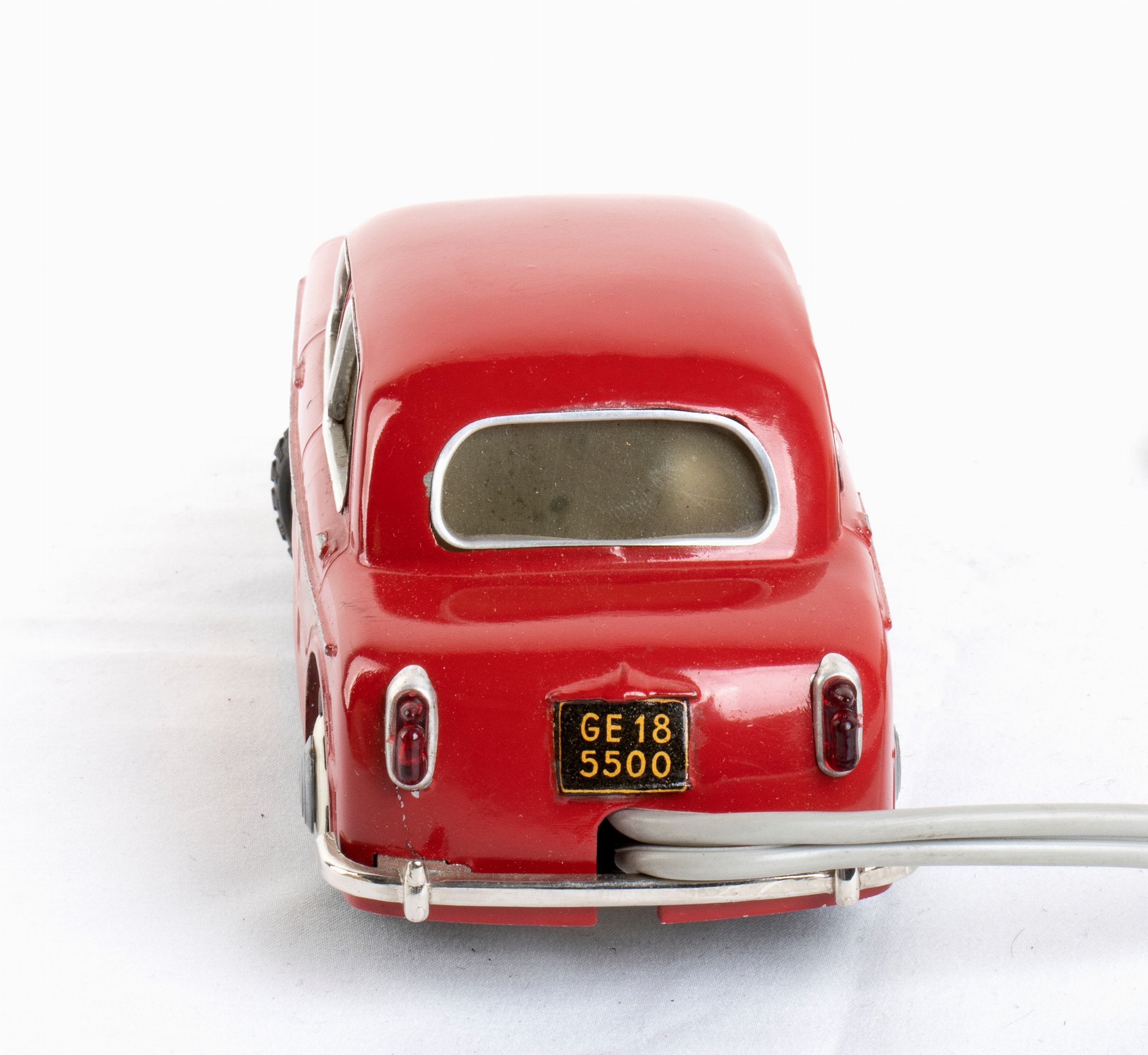 1950s Modello in metallo prodotto dalla DOMO di Bologna denominato NUOVA 1100 coevo all'uscita della FIAT 1100 (per evidenti motivi di proprietà , la DOMO non potè esplicitamente chiamare il giocattolo con il nome di FIAT 1100) Filoguidata, comando in plastica, meccanismo di carica a molla completa di chiave di carica, in scatola originale. In ottime condizioni, lievissimo segno sulla carrozzeria, pneumatici in gomma, borchie con logo simil-FIAT, targa GE 185500. Marcata sul fondello DOMO CAT 800/1 Made in Italy- Brevettato. Scatola originale con etichette applicate di fabbrica NUOVA 1100