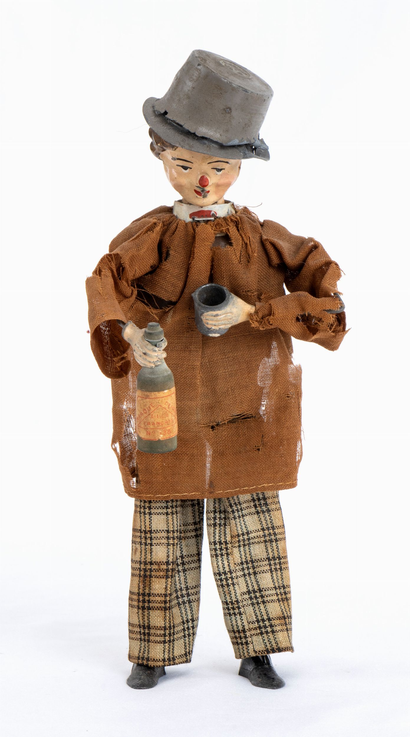 cm.18 Automa in metallo e latta dipinta a mano, con meccanismo di carica a molla, fine '800 inizio '900. Bevitore ubriaco, con bottiglia di champagne e bicchiere in mano, cappello a cilindro in testa. Marcato DEPOSE F.M. sul cappello e ARTICLE FRANCAIS sulla targhetta applicata alla bottiglia