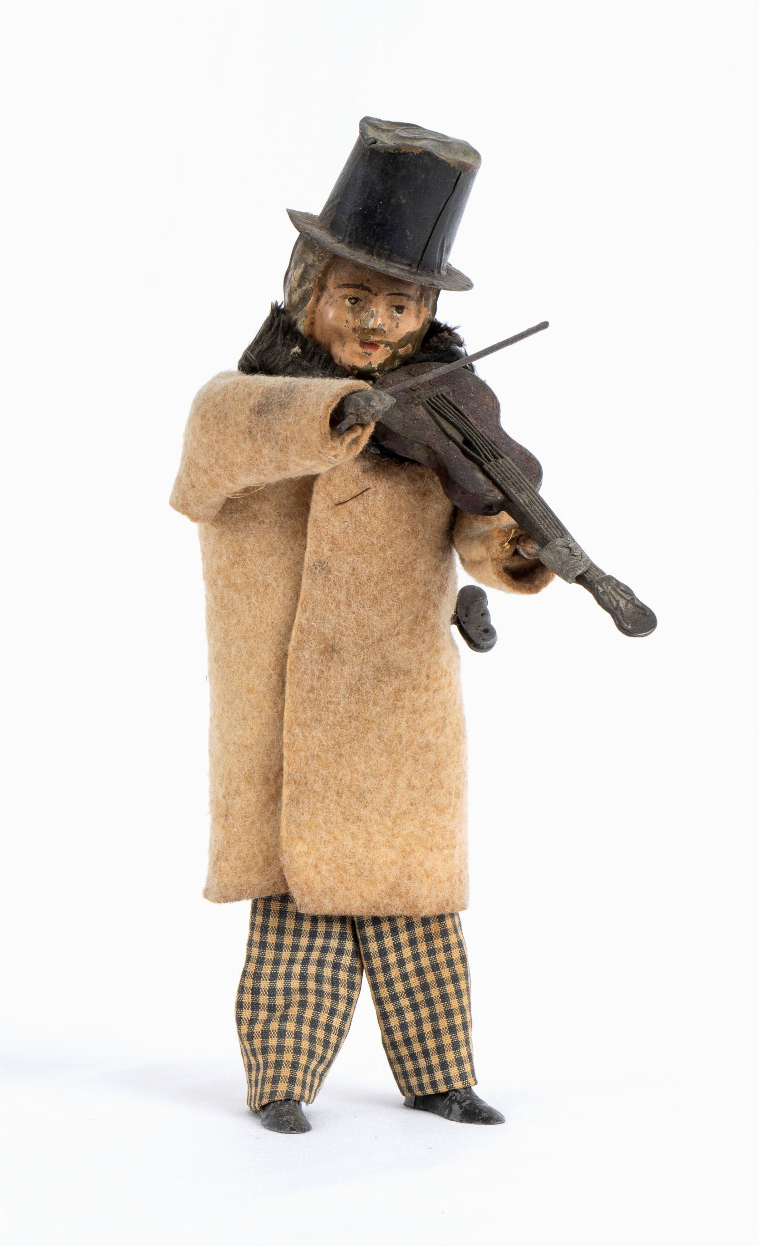 cm.18 Automa in metallo e latta dipinta a mano, con meccanismo di carica a molla, fine '800 inizio '900. Suonatore di violino, con cappotto bianco, pantaloni a quadretti, e cappello a cilindro in testa. Marcato DEPOSE F.M. sul cappello