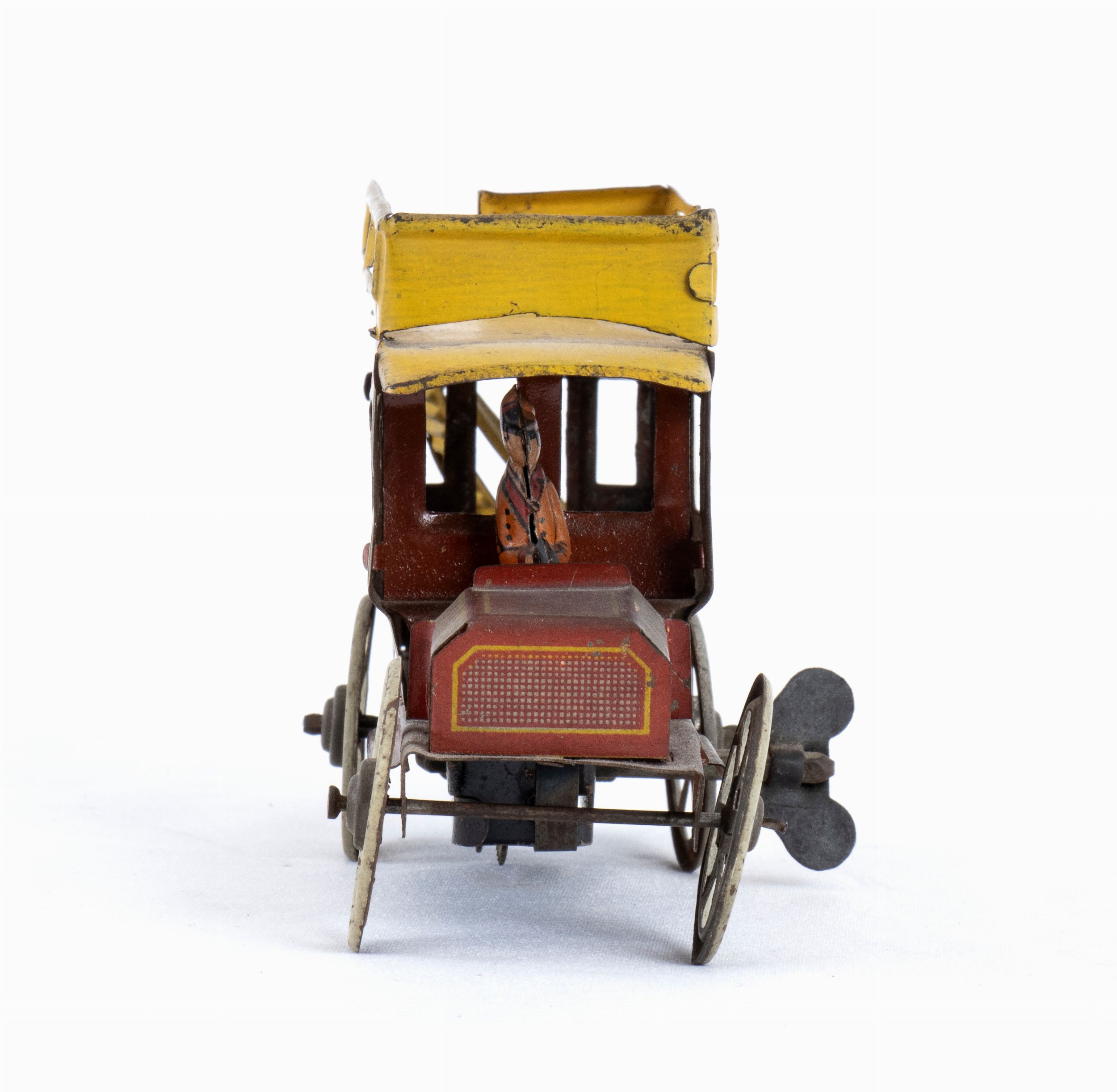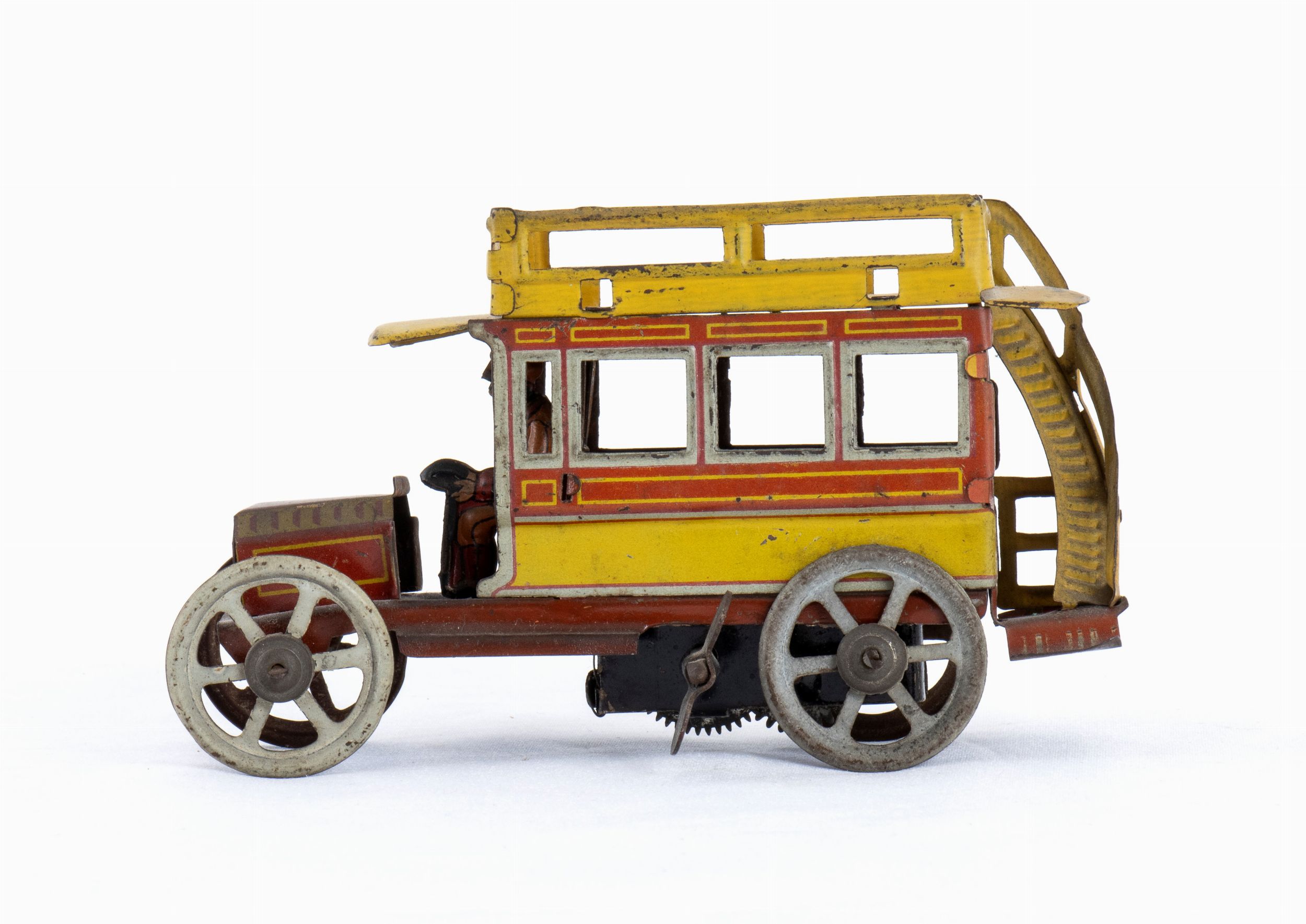 Penny toy in latta litografata, della FISHER, Made in Germany, con meccanismo di carica a molla, completo del conducente originale. Anni '930.