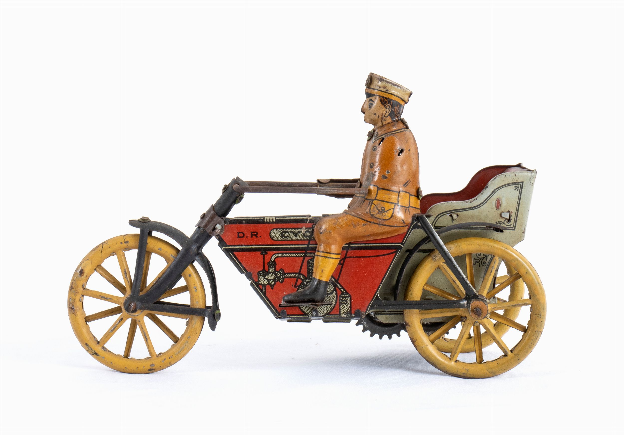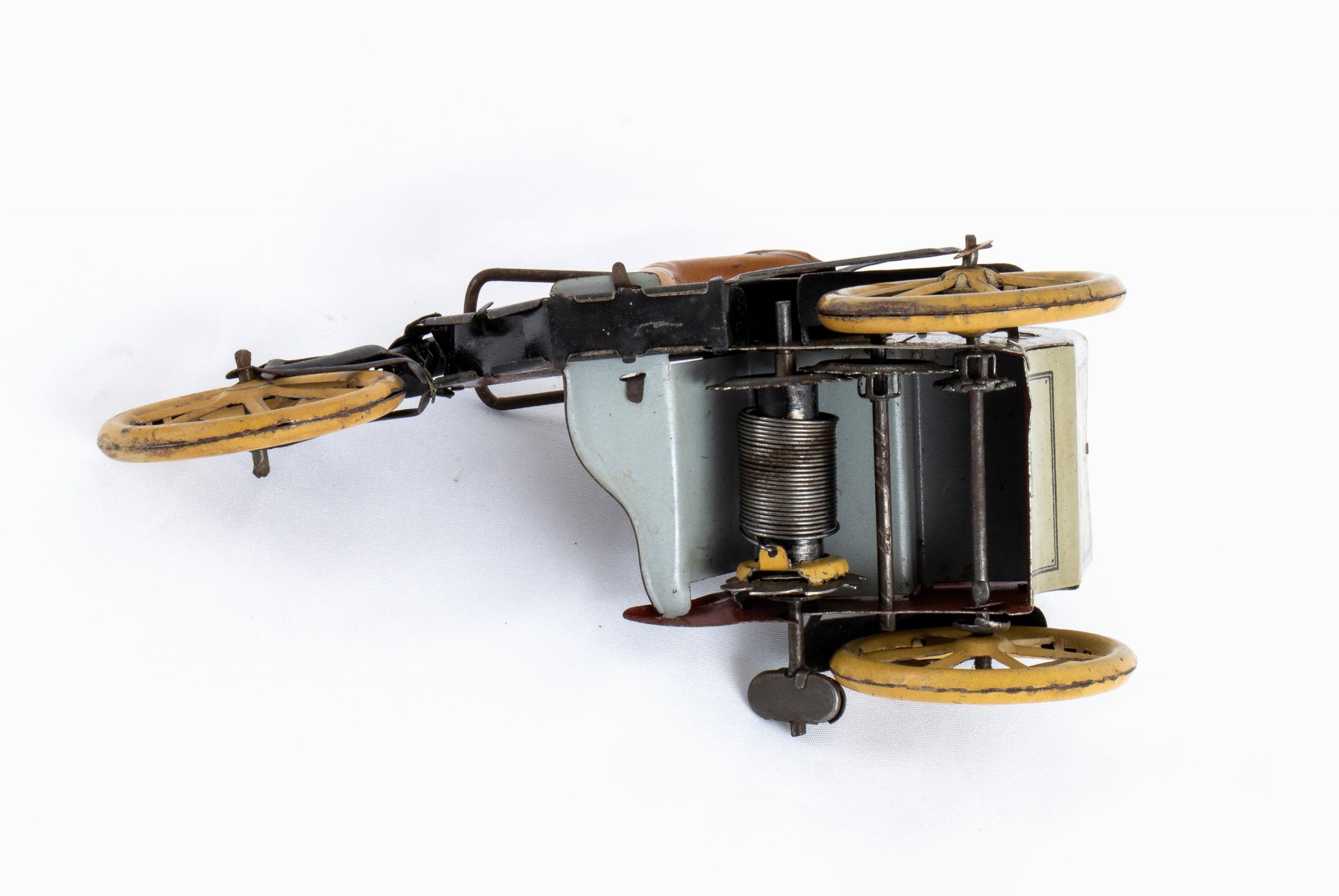cm.18 Giocattolo in latta litografata, moto modello CYCLON come litografato sul serbatoio della benzina, completo di sidecar e di guidatore. Meccanismo di carica a molla. Marcato al retro G&K 507/8 Made in Germany, circa 1925
