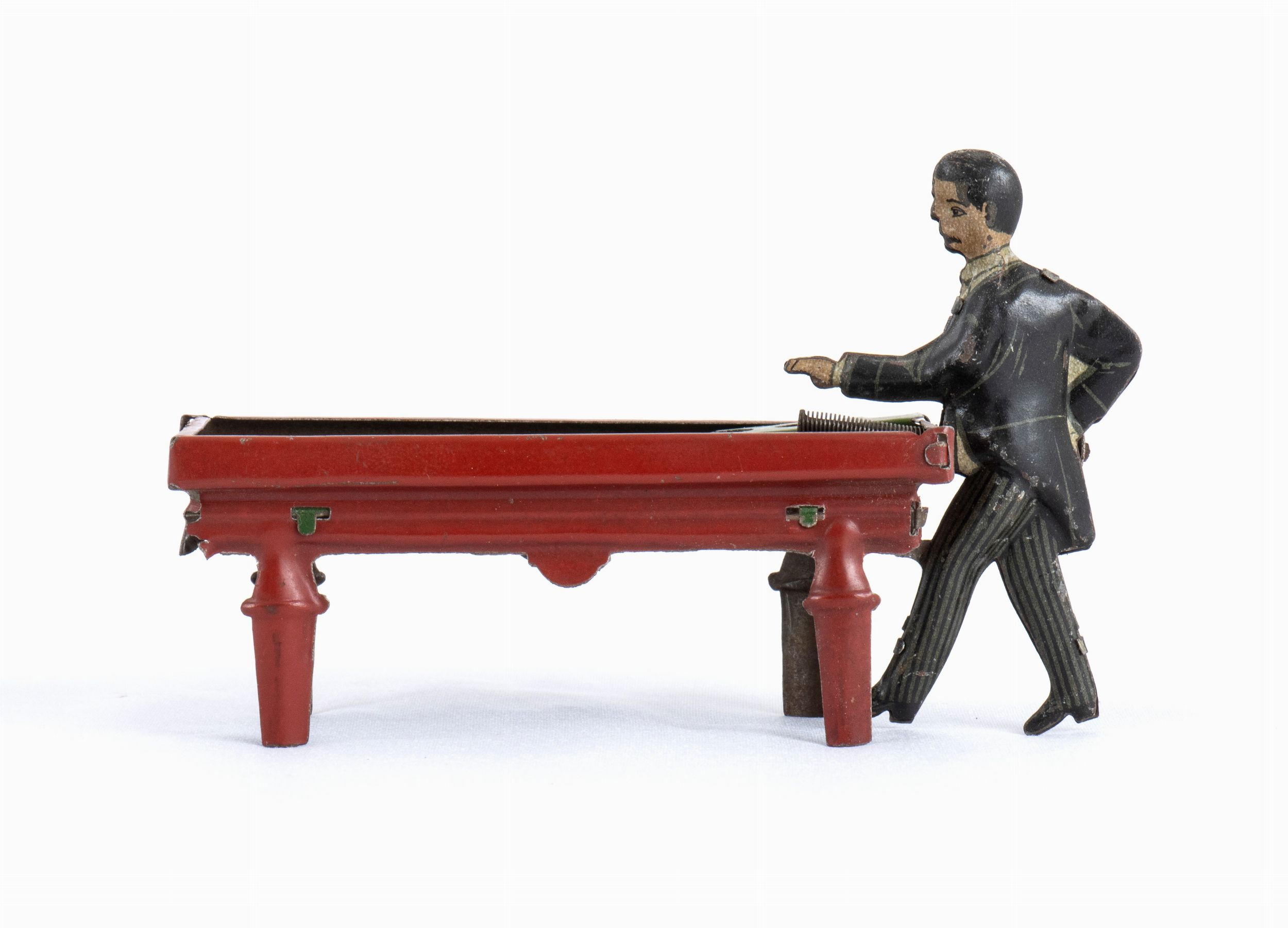 Penny toy, in latta litografata, primi '900. Giocatore di biliardo, con pallina in metallo, Made in Germany. Funzionamento con molla manuale
