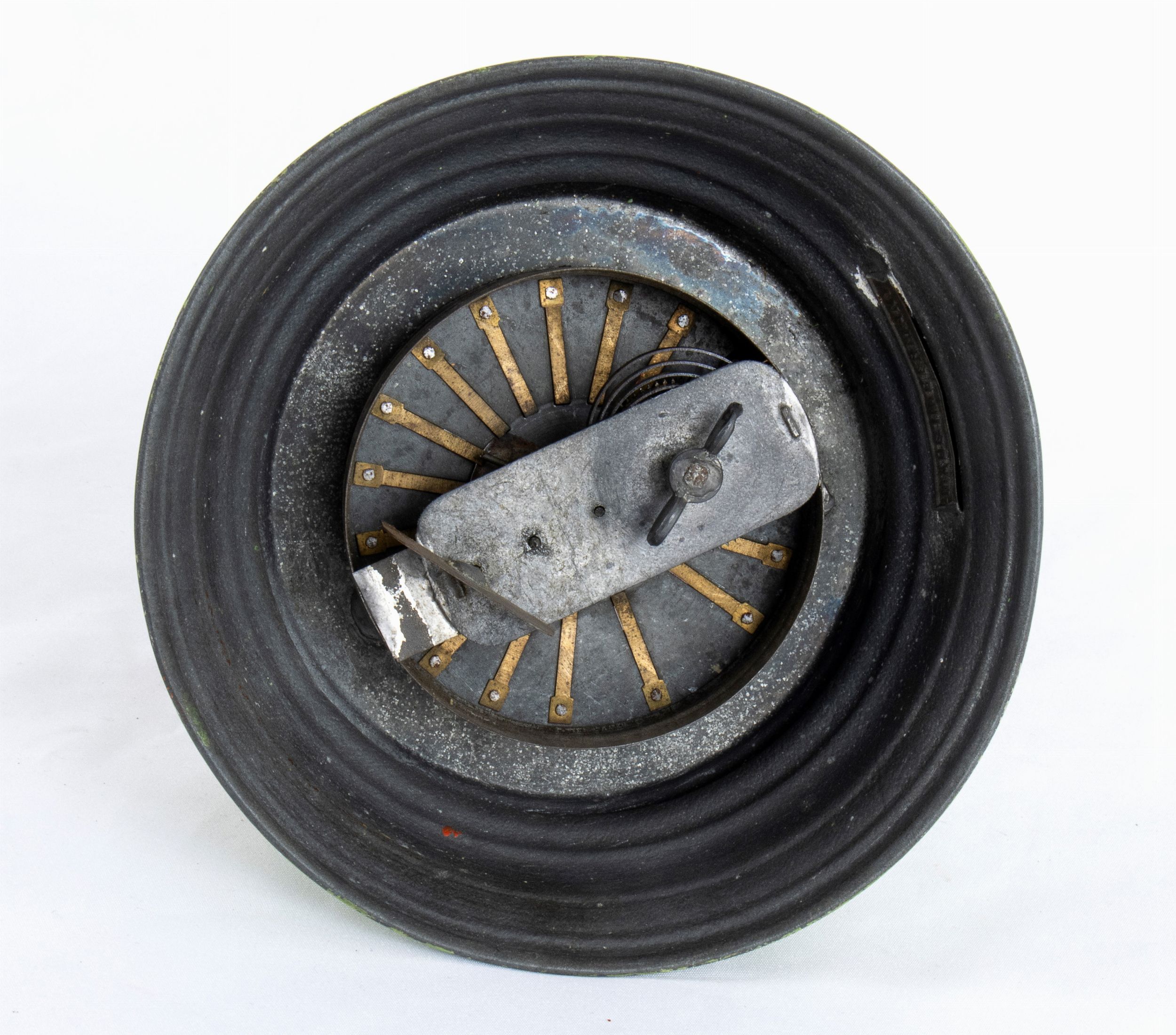 cm.22 Automa in latta dipinta a mano, suonatore di Banjo, con carica a molla. Personaggio di colore come era consueto nel periodo 1880-1920 trovare band musicali composte da suonatori di colore. Su base semiconica, con carillon interno. Placchetta di metallo che riporta PATENT N.19 , il giocattolo è Made in Germany , Gunthermann