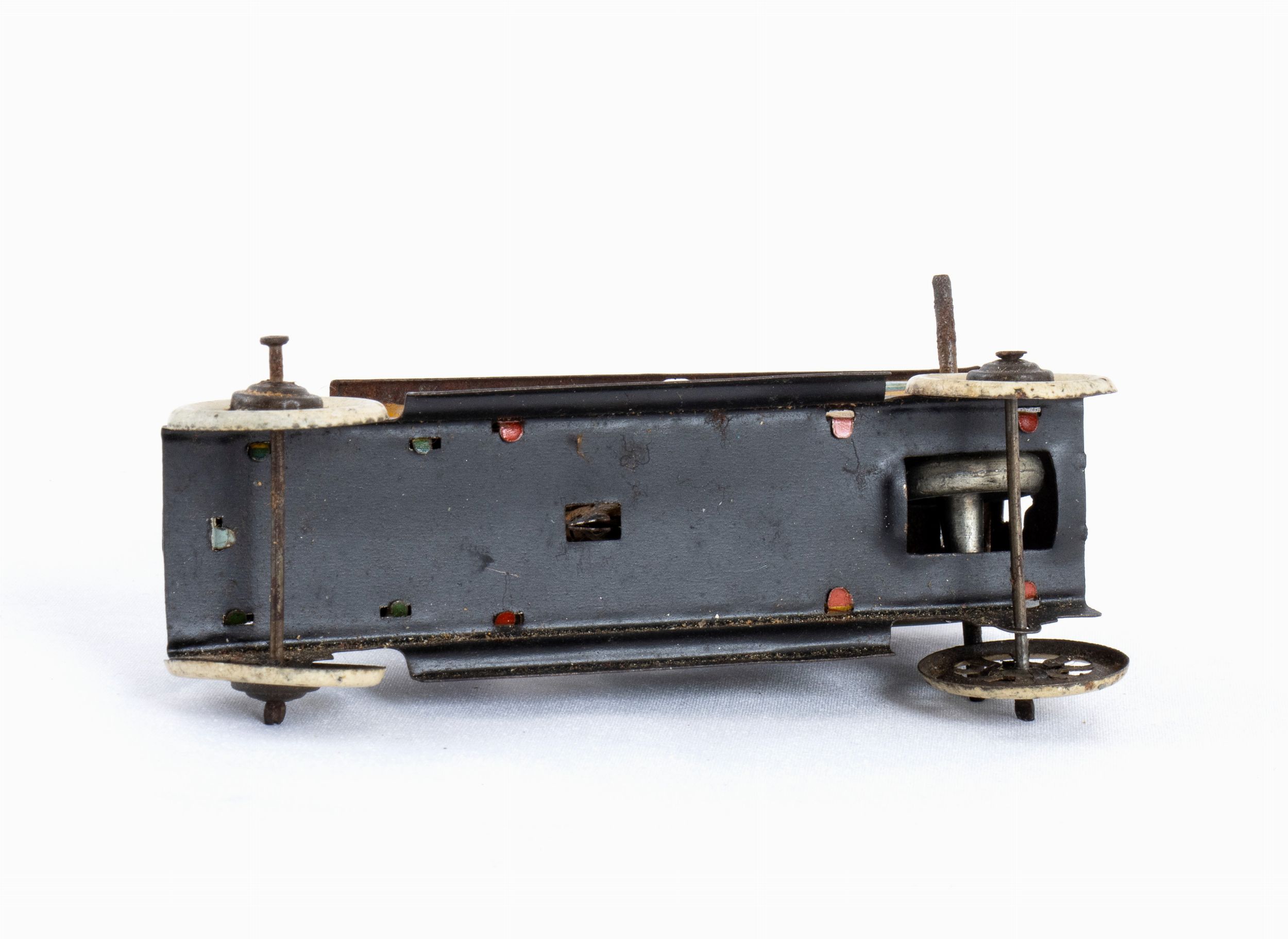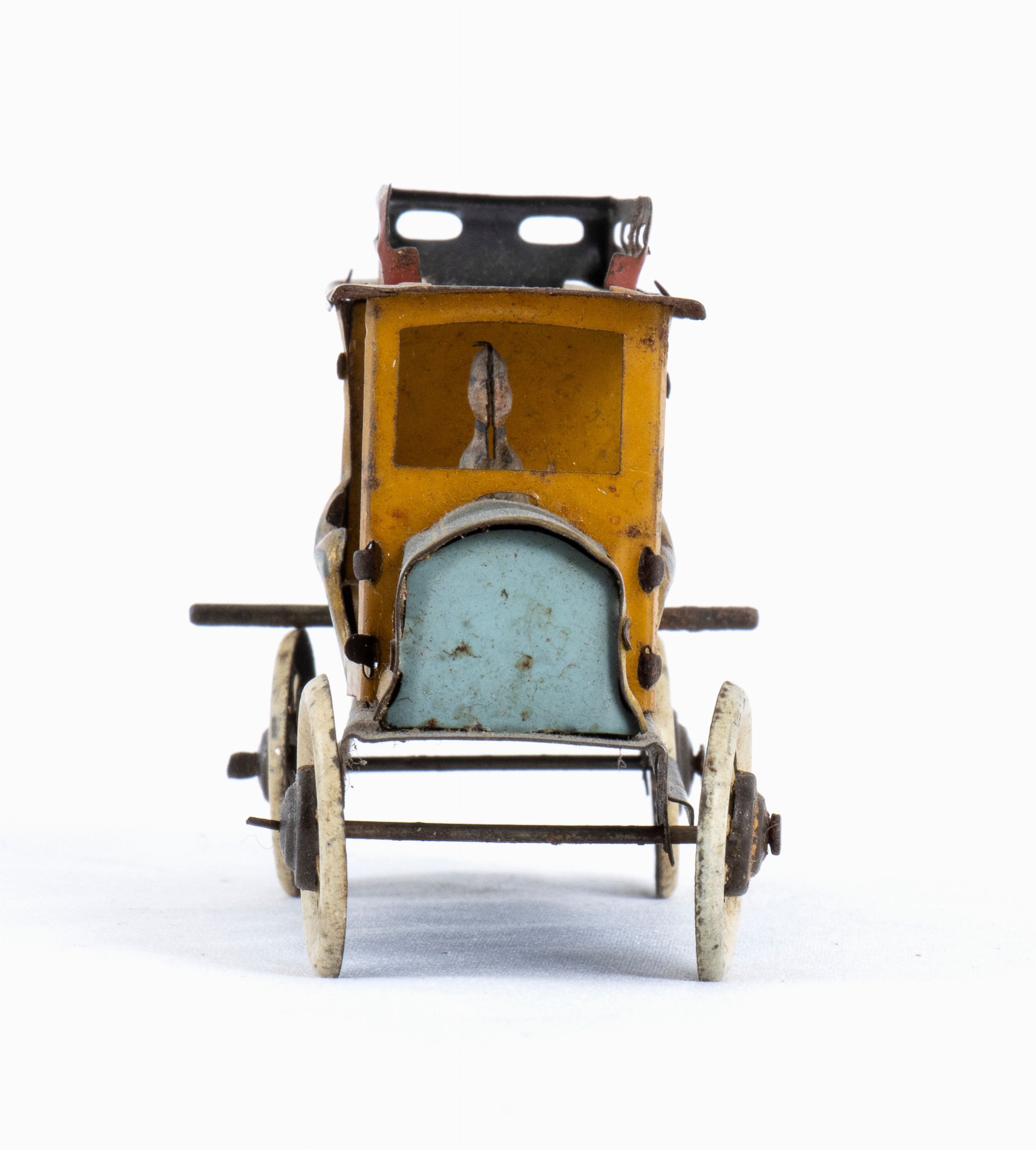 Penny toy in latta litografata, HESSMOBIL Germany, con meccanismo a volano. Autista esterno originale, 4 personaggi interni litografati. Anni '910