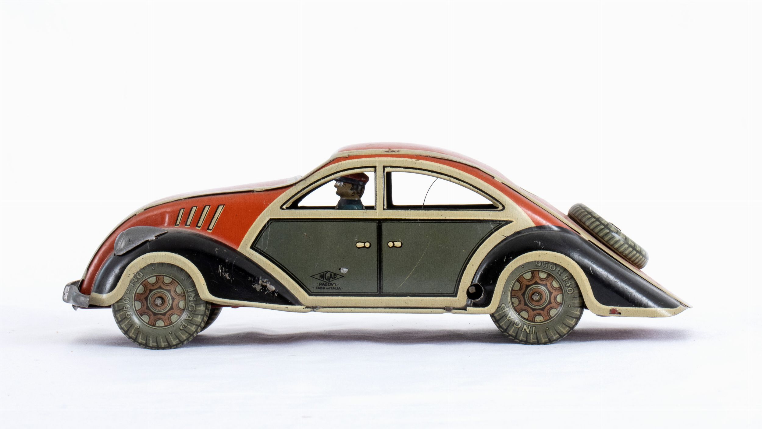 cm.24 Latta litografata, modello di auto stile decò, targata PD 1500, colore rosso, grigio e passaruote indaco. Con pilota originale, ruota di scorta, paraurti. Ruote litografate marcate INGAP 950x140. Meccanismo di carica a molla. Giocattolo anni '930, marcato INGAP