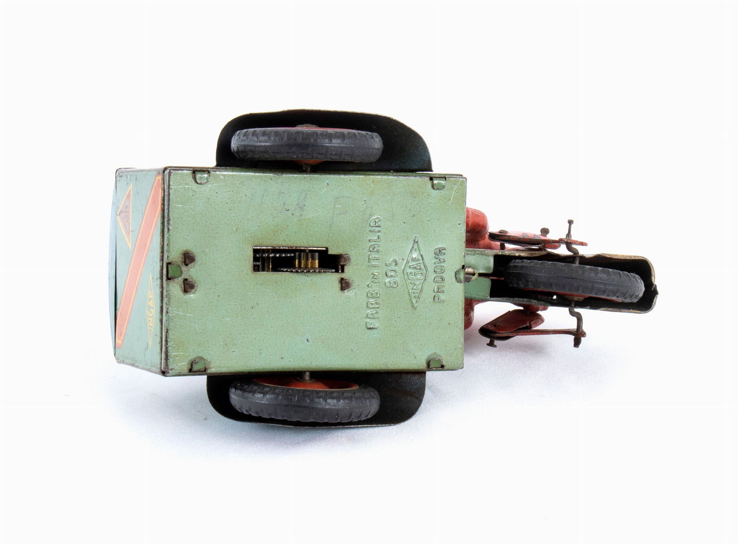 cm.13 Ciclo cassonato, per trasporto merci dei GRANDI MAGAZZINI, con fattorino/ciclista. Il ciclo è in lamiera litografata, il ciclista è realizzato in composizione dalla ditta CC. Confalonieri di Milano. Cassone apribile, pneumatici in gomma, meccanismo di carica a molla. Anni '950