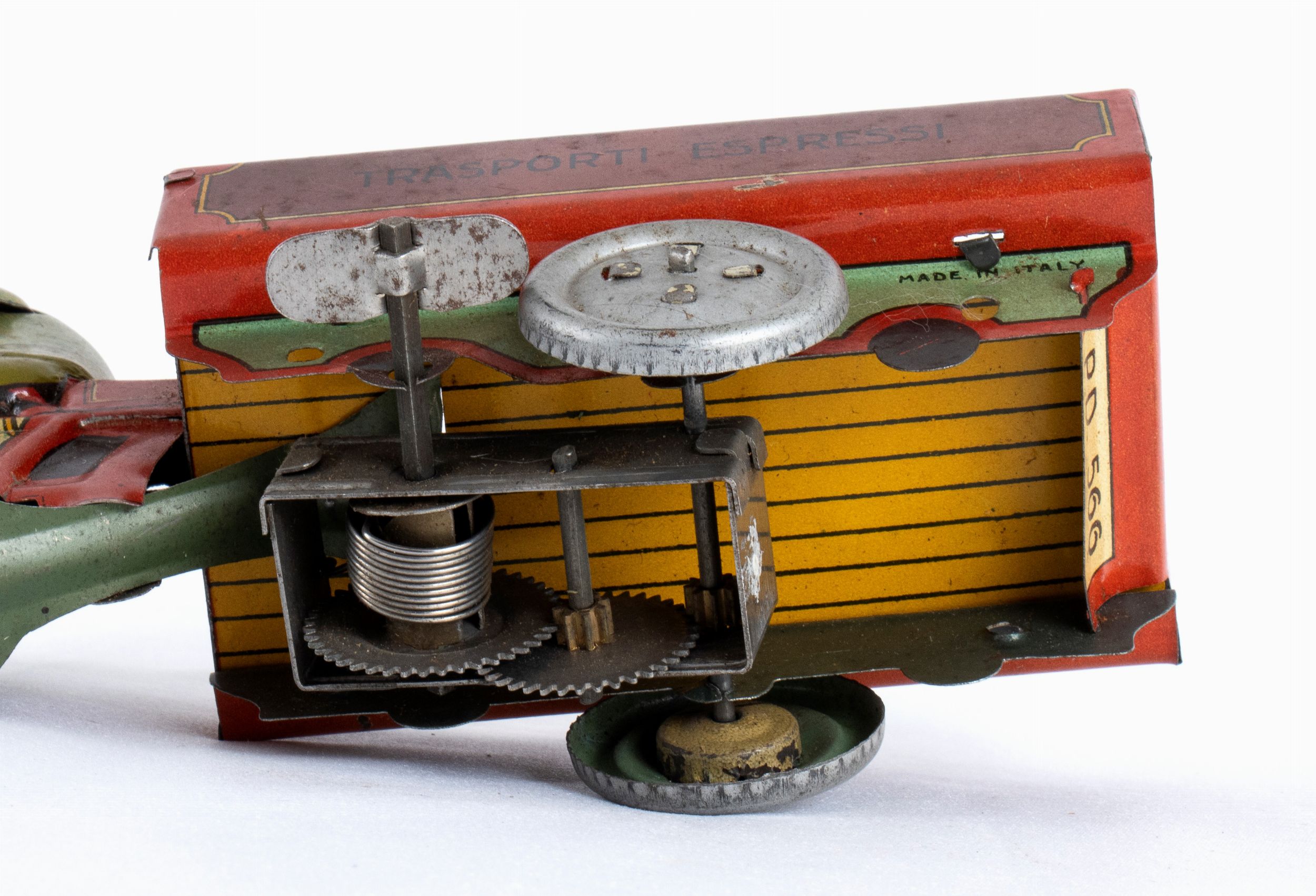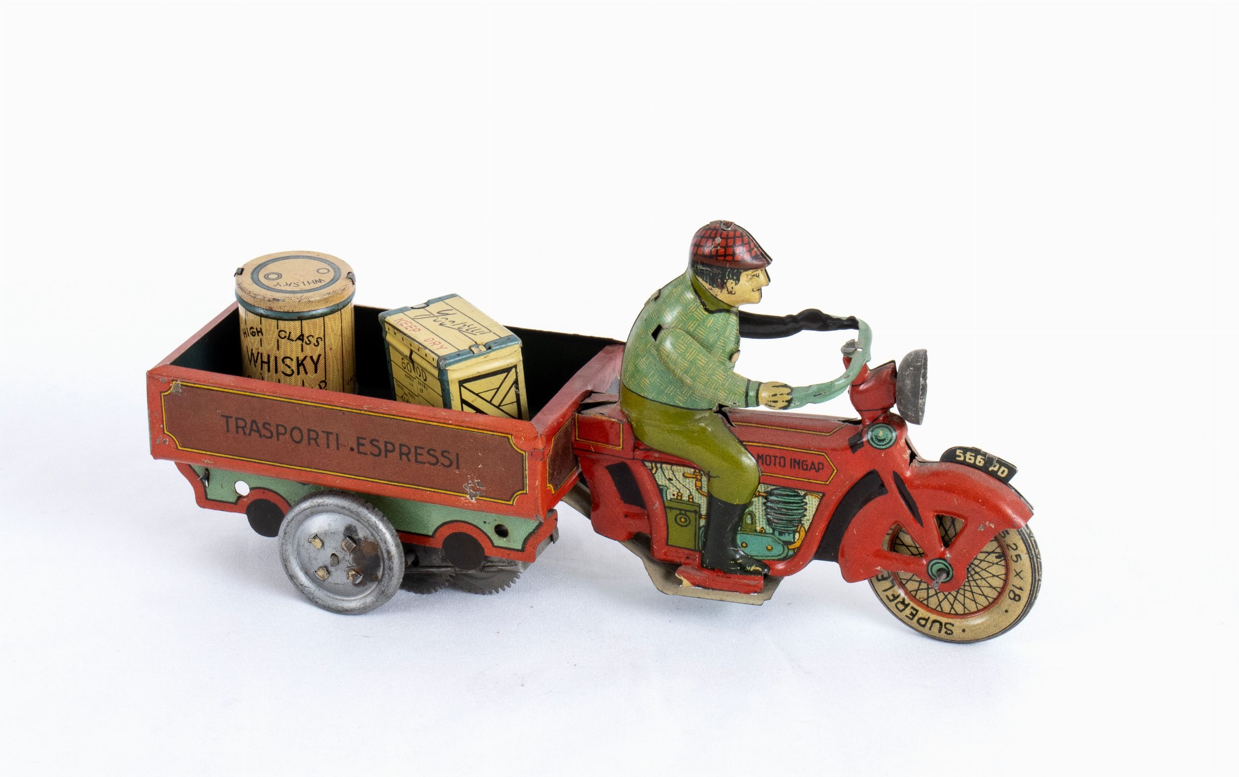 cm.19 Motocarrozzetta MOTO INGAP targata PD 566, con cassone a rimorchio per TRASPORTI ESPRESSI. Latta litografata, meccanismo di carica a molla con chiave fissa. Ruota litografata SUPERFLEX INGAP 525x18. Con aggiunta di una cassa ed un barile in latta litografata, Made in Japan, ALPS, per simulare un piccolo carico di trasporto. Motocarro anni '930