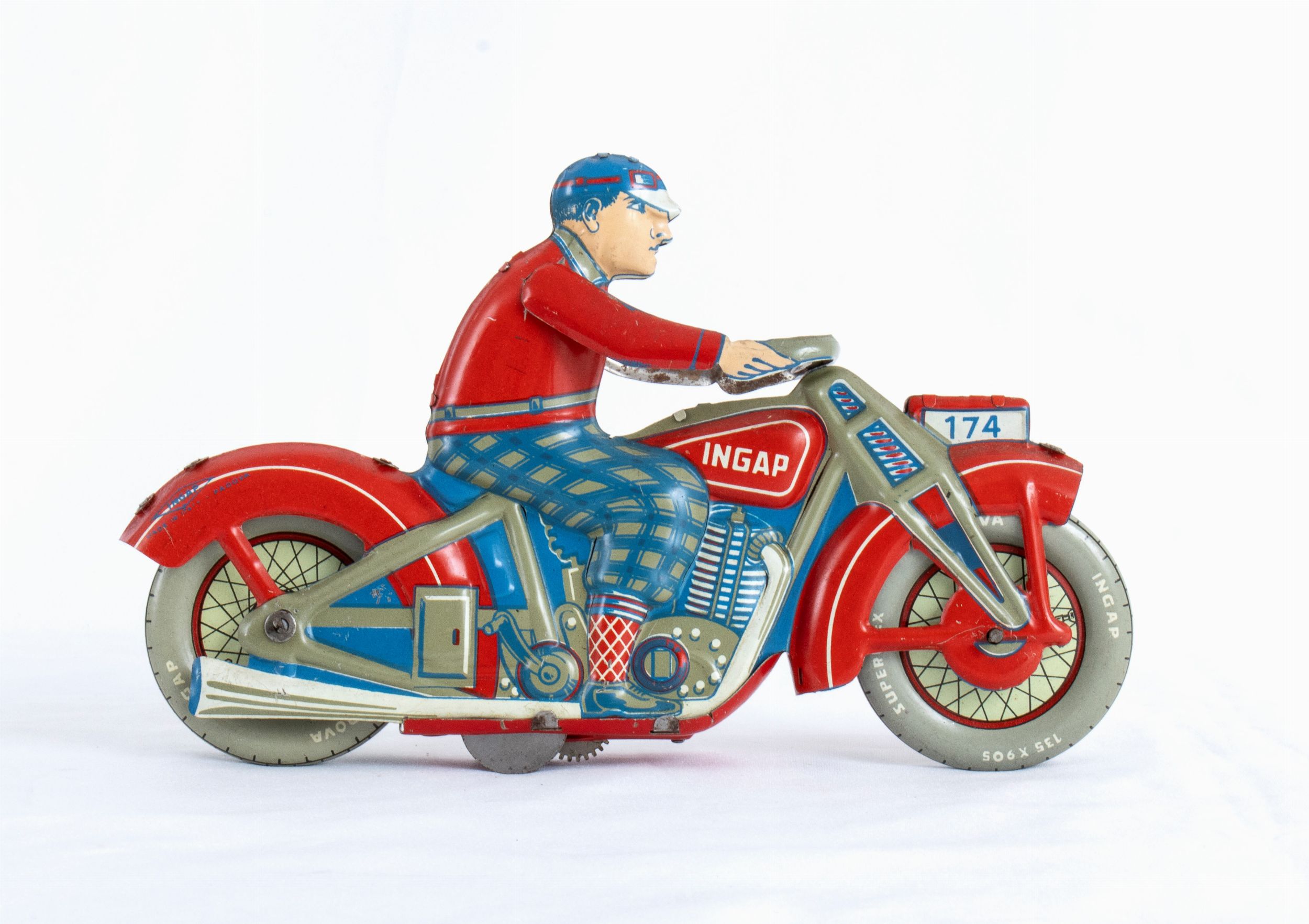 Giocattolo in latta litografata, moto INGAP 174, con guidatore. Ruote litografata INGAP PADOVA SUPERFLEX 135x905 , meccanismo di carica a molla. Originale anni '950