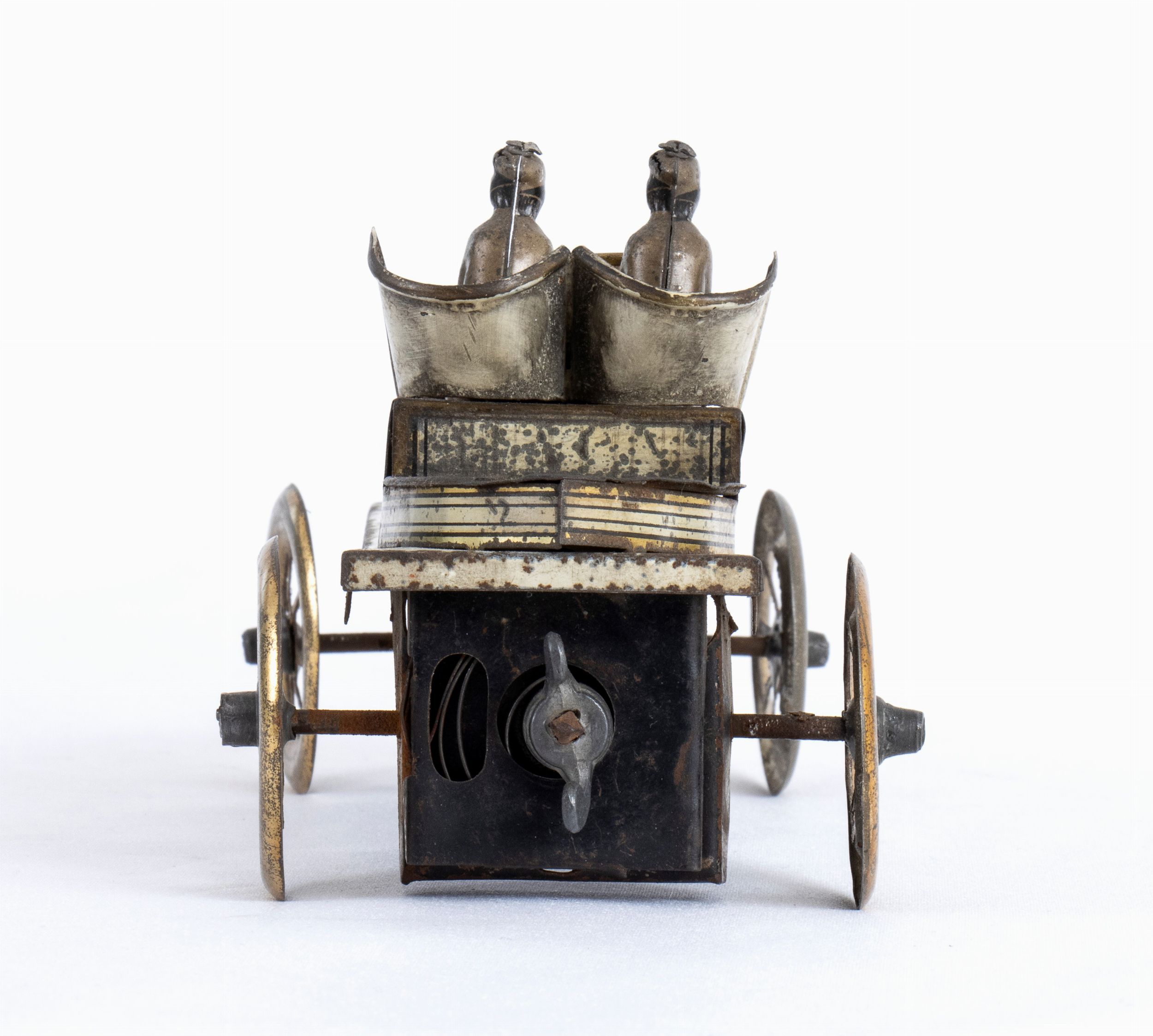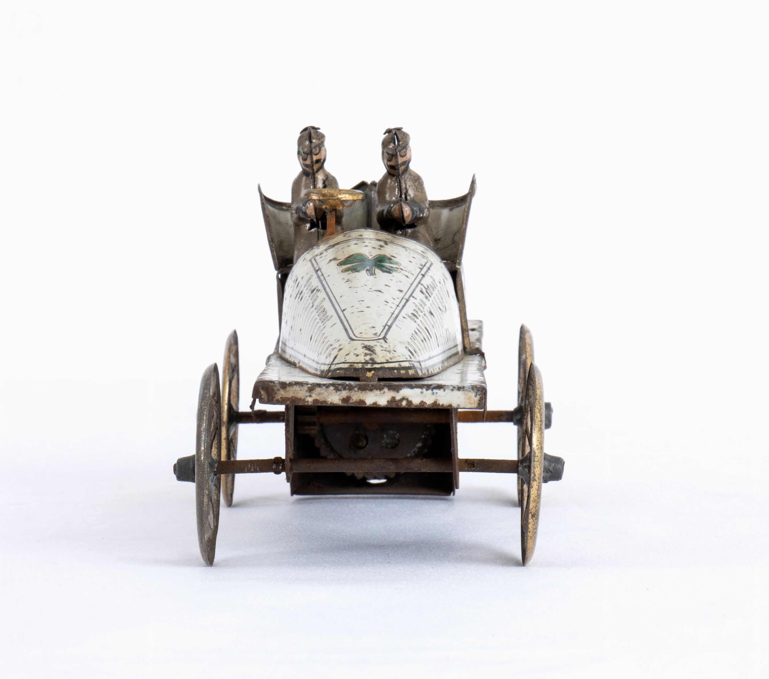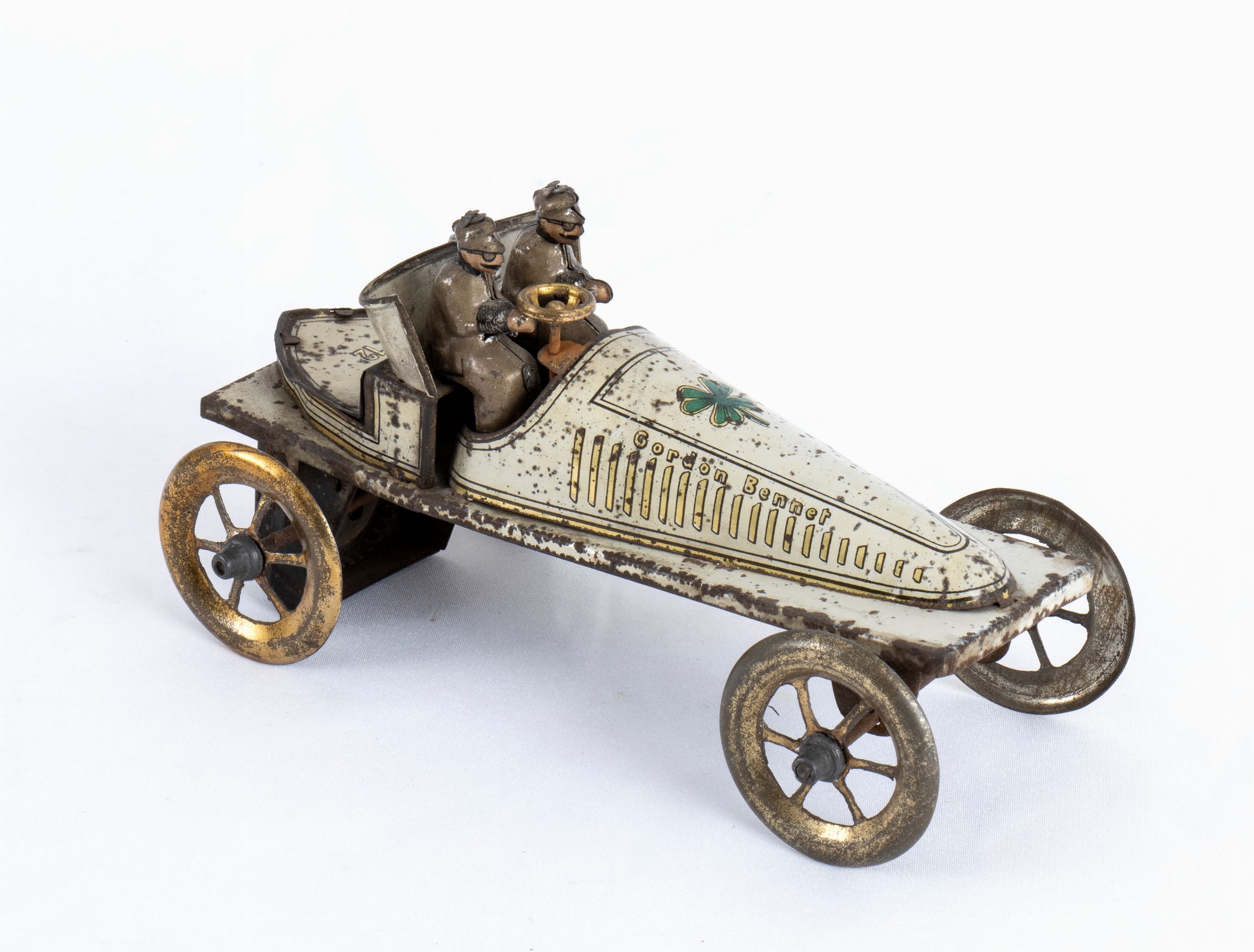 Meravigliosa e rara auto da corsa GORDON BENNET , con numero di gara 12, quadrifoglio litografato sul cofano motore, dicitura GORDON BENNET ai lati della carrozzeria. In latta litografata bianca con dettagli in oro, ruote sterzanti, con pilota e co-pilota originali, meccanismo di carica a molla fisso. Made in Germany, non marcata, ISSAMYER (o prababile FISHER ?) Anno 1910-1912