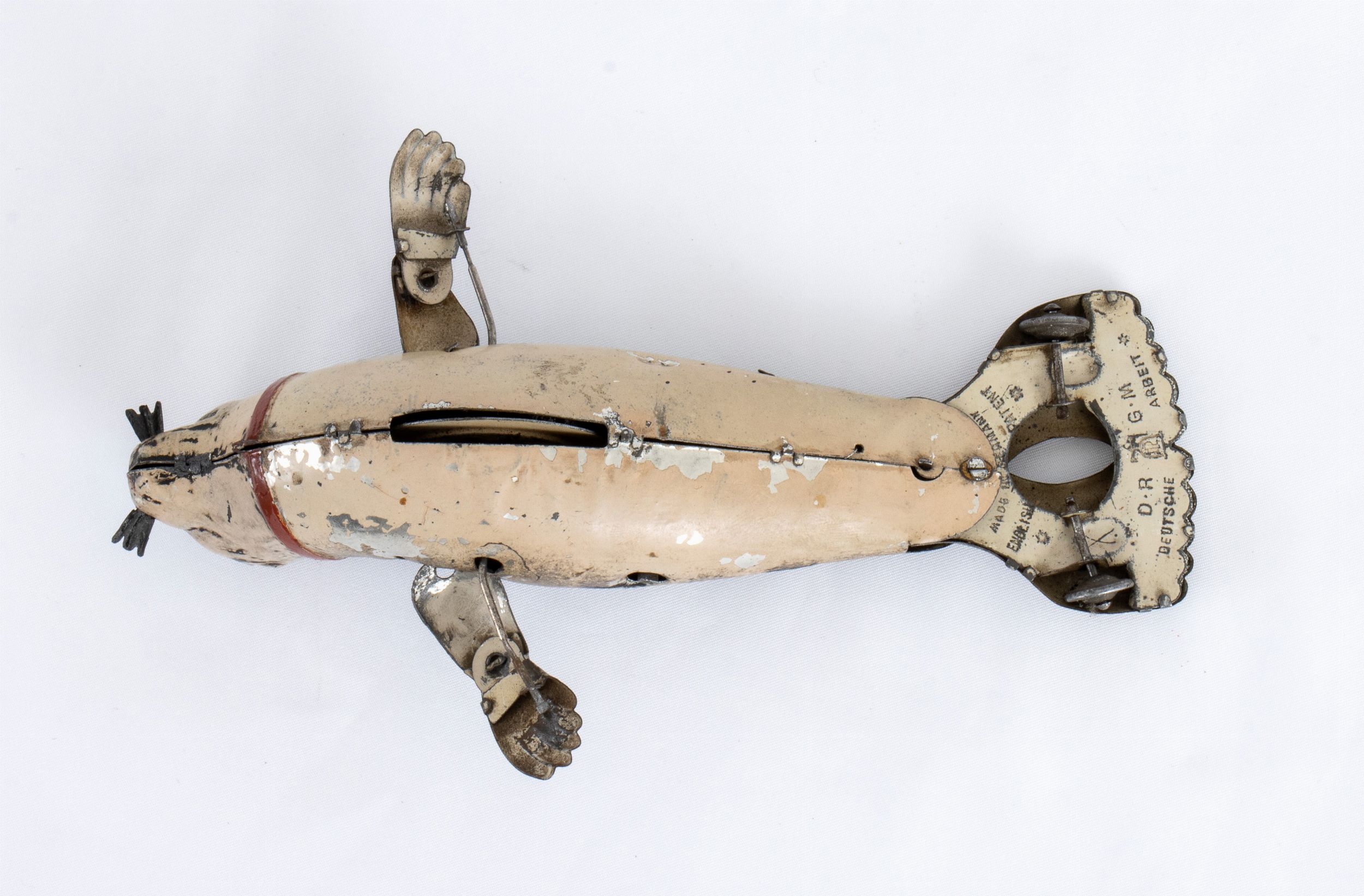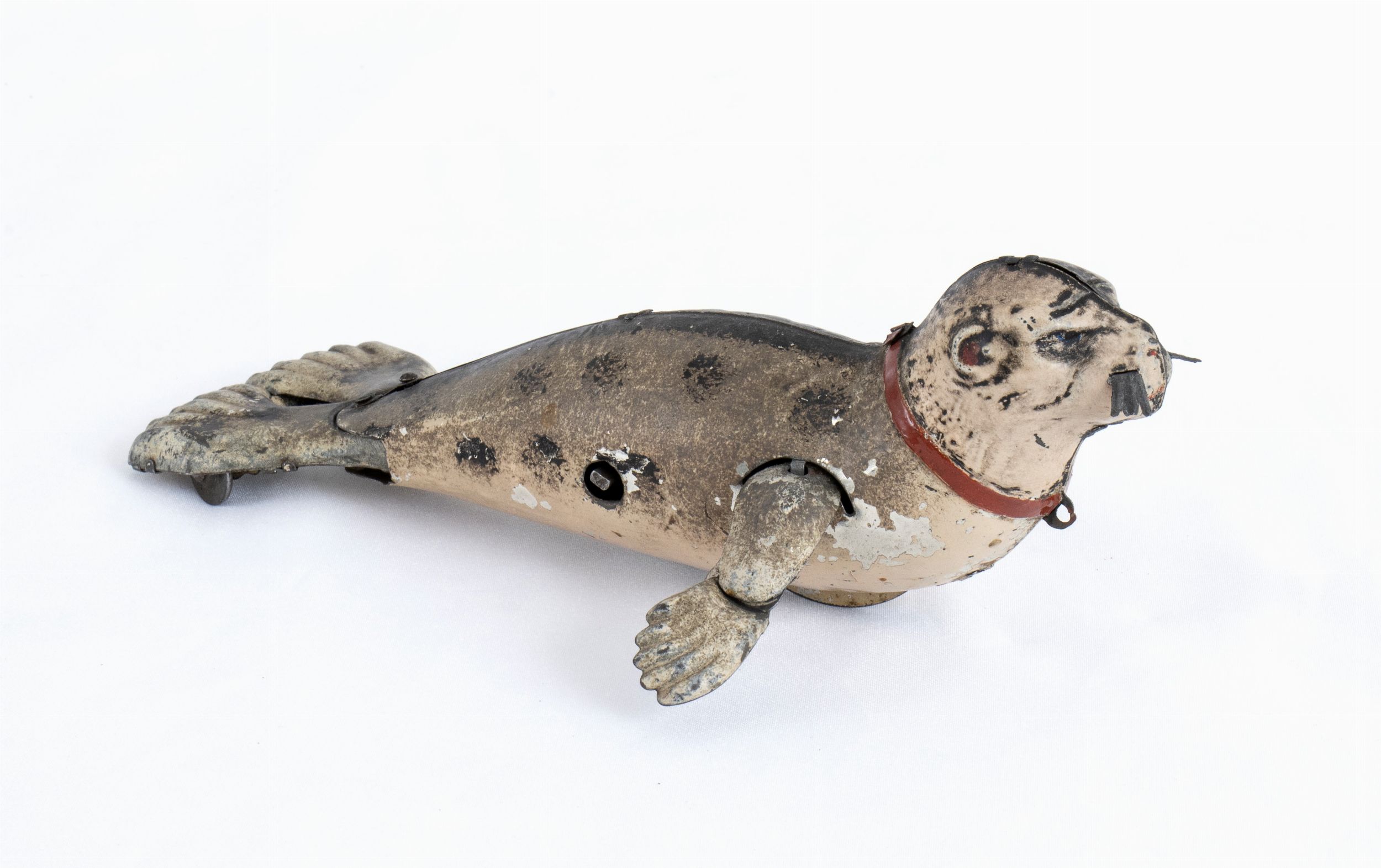 cm.19 Foca in latta litografata, 1900-1930, carica a molla, coda e pinne frontali che si muovono simulando il movimento del simpatico mammifero marino. Marcato DRGM DEUTSCH ARBEIT Made in Germany con logo EPL LEHMANN sulla coda. Nel 1900, il giocattolo fu commercializzato come The Performing Sea Lion e fu ispirato dalla visita di Lehmann alla Cliff House di San Francisco dove osservò le foche prendere il sole sulle rocce, secondo il libro di Cieslik, Lehmann Toys.