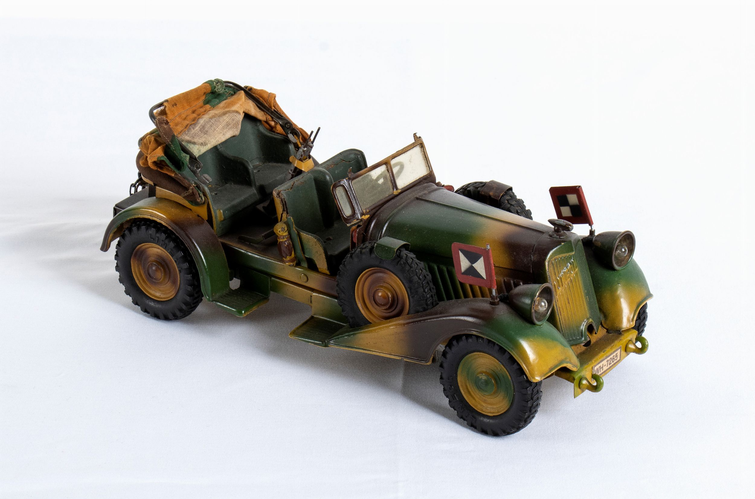 Latta, cm.25 1930s Auto Kubelwagen della Lineol, made in Germany. Livrea mimetica, versione Wermacht con targa WH 7265, fari elettrici, tendalino mimetico. Motore con carica a molla funzionante. In ottime condizioni, lievi segni del tempo. Pneumatici in gomma marcati LINEOL