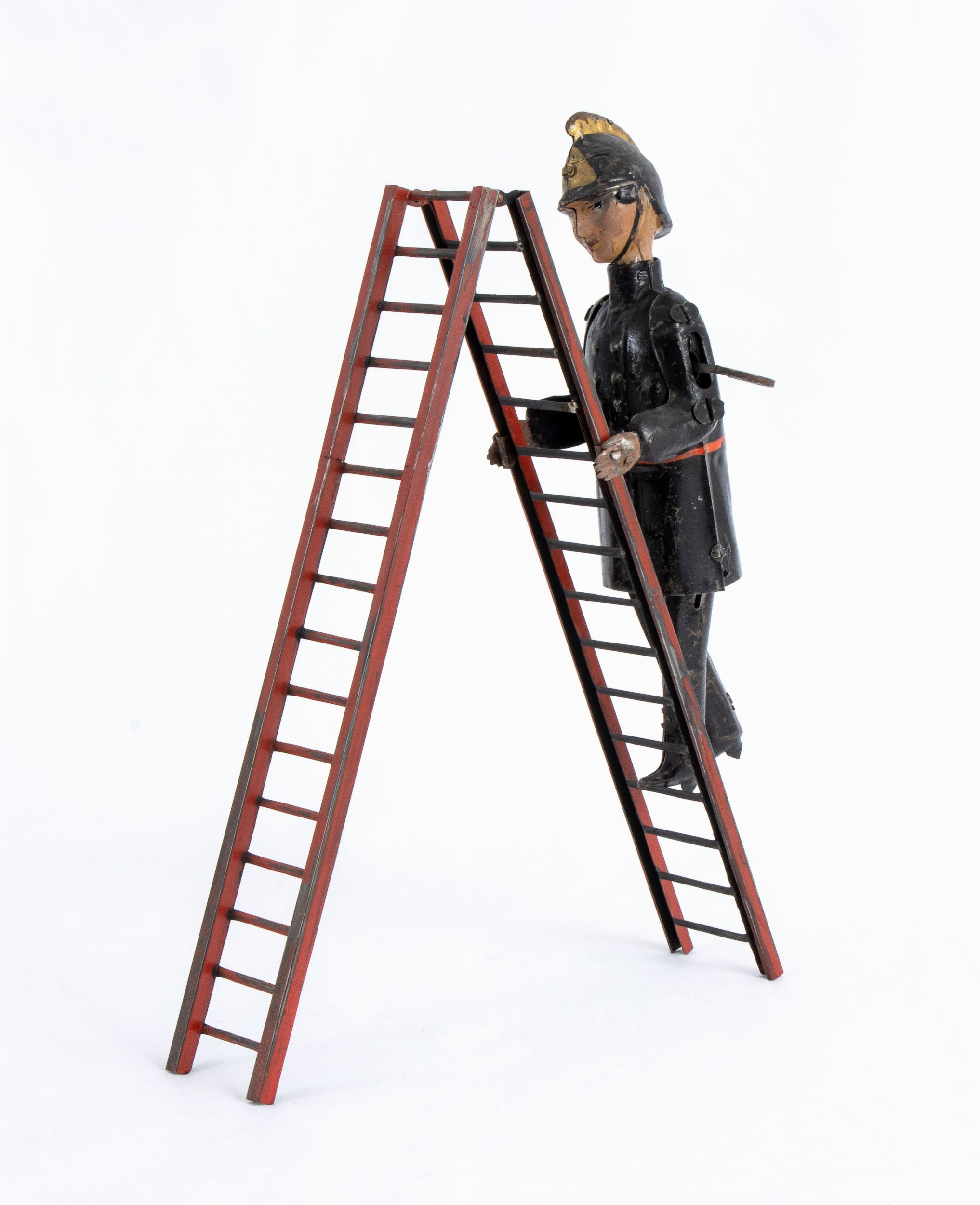 Latta dipinta, cm.20 1890s Personaggio in latta dipinto a mano, Vigile del Fuoco in uniforme di servizio, con elmo, che sale la scala. Scala pieghevole. Meccanismo di carica a molla, funzionante. Marcato Fernand Martin, Francia, giocattolo di fine '800 inizi '900. In buone condizioni