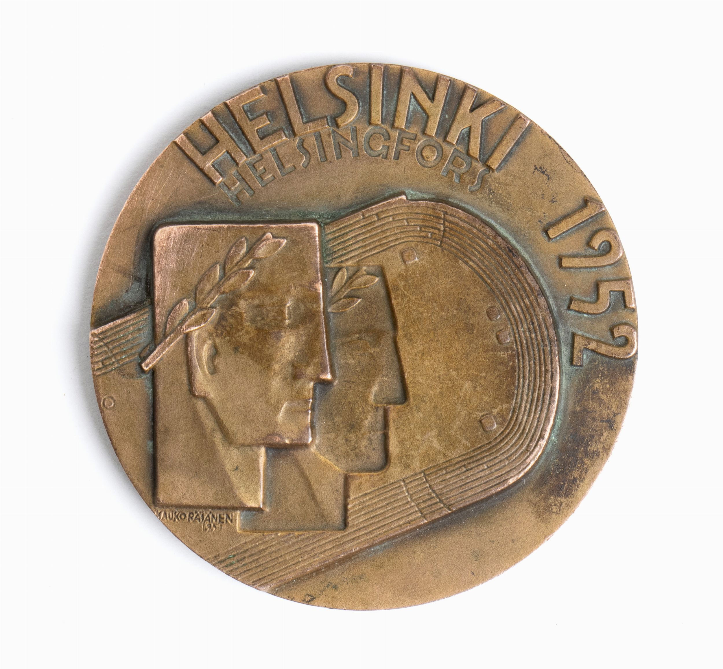 1952 Medaglia in bronzo di partecipazione per atleti ai giochi olimpici della XV OLYMPIA HELSINKI 1952 HELSINGFORS - Disegnata e firmata da Kauko Räsänen, realizzata da Veljekset Sundqvist Oy - Patina del tempo, nessun danno, condizioni molto buone