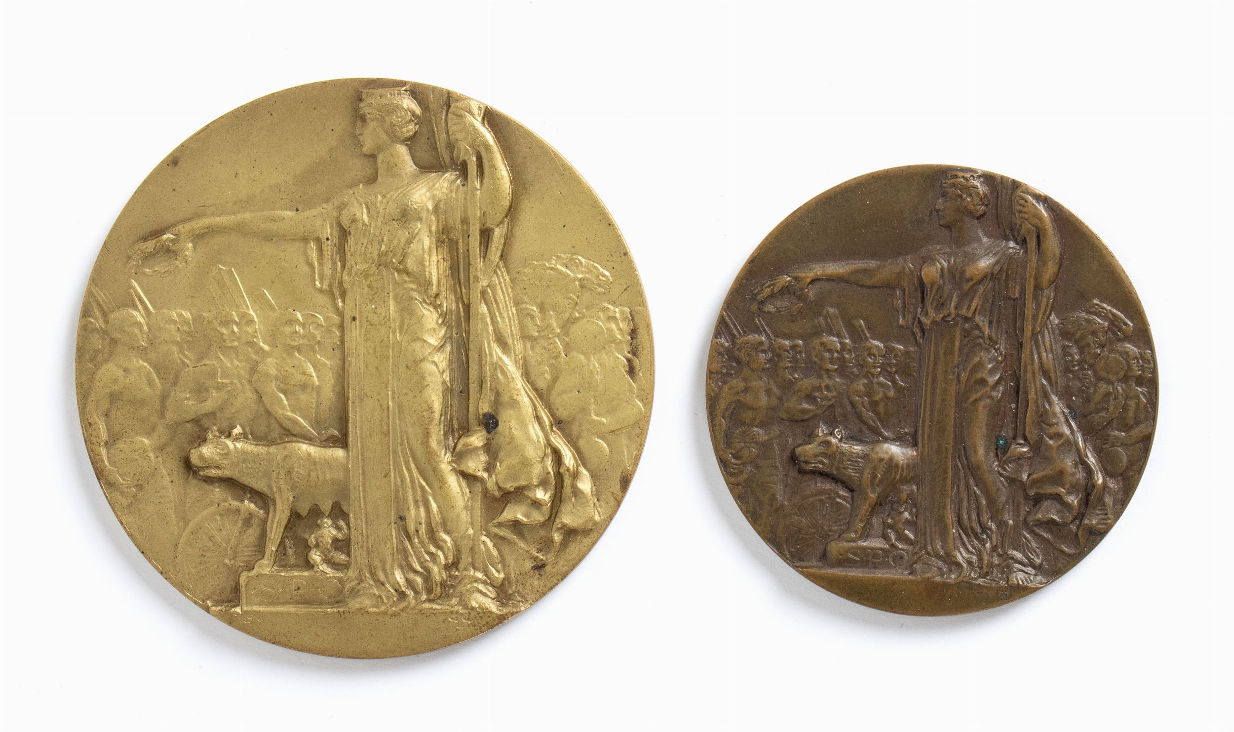 1950s Lotto di due medaglie a modulo medio, bronzo e bronzo dorato Comitato Olimpico Nazionale Italiano, Johnson Milano. Buone condizioni