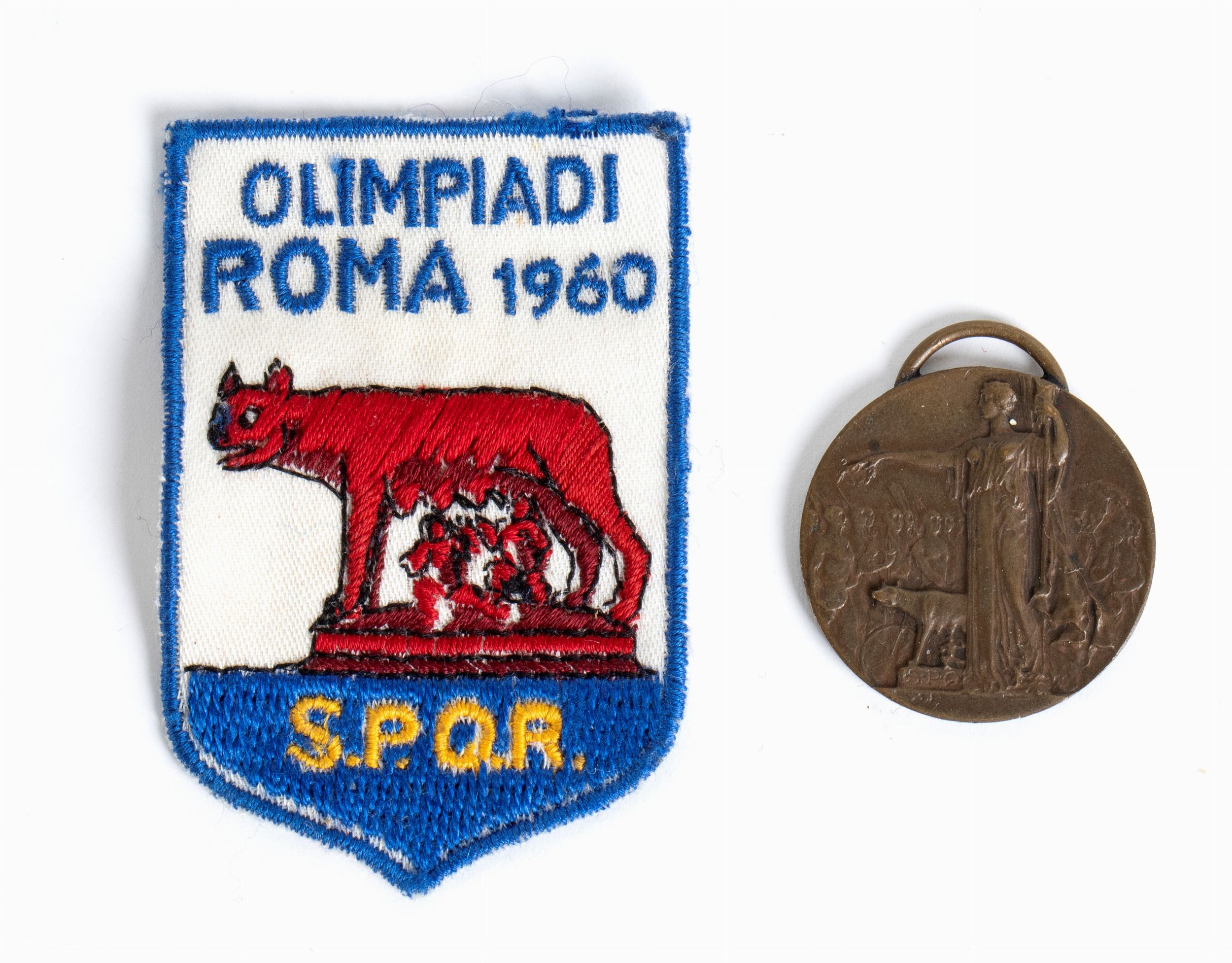 1960 Lotto composto da patch in stoffa OLIMPIADI DI ROMA 1960 e medaglietta in bronzo del CONI Citius Altius Fortius, Johnson Milano