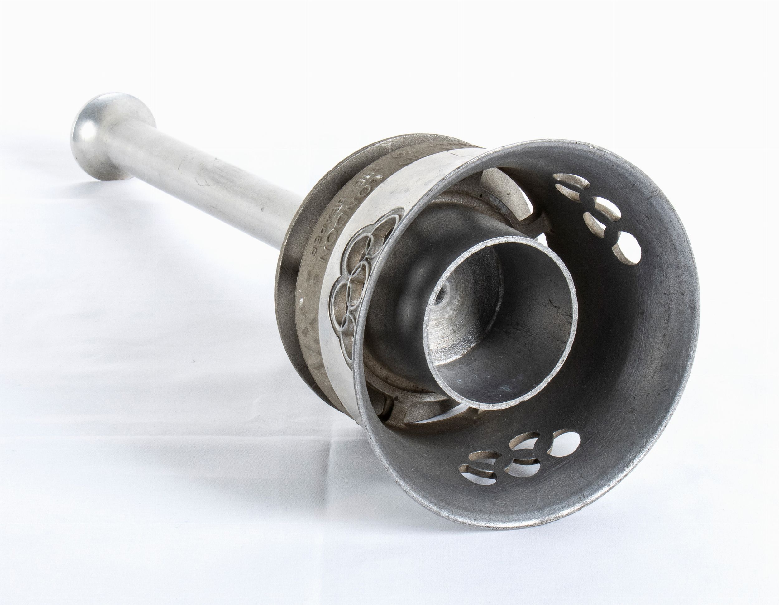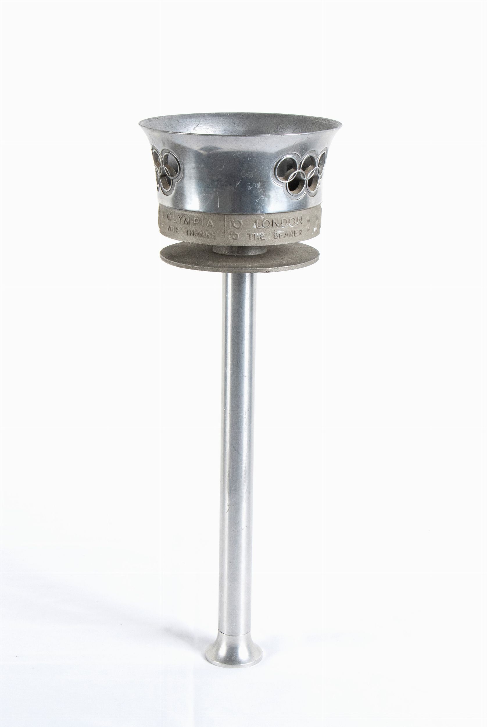 alluminio, cm.41 1948 Torcia originale per la XIV edizione delle Olimpiadi estive svoltesi a Londra nel 1948. In fusione di alluminio, con iscrizione a rilievo lungo la circonferenza del braciere che recita Olympia to London With thanks from the bearer XIVth Olympiad 1948 e con i cinque cerchi olimpici. La torcia è in ottime condizioni, non presenta rotture