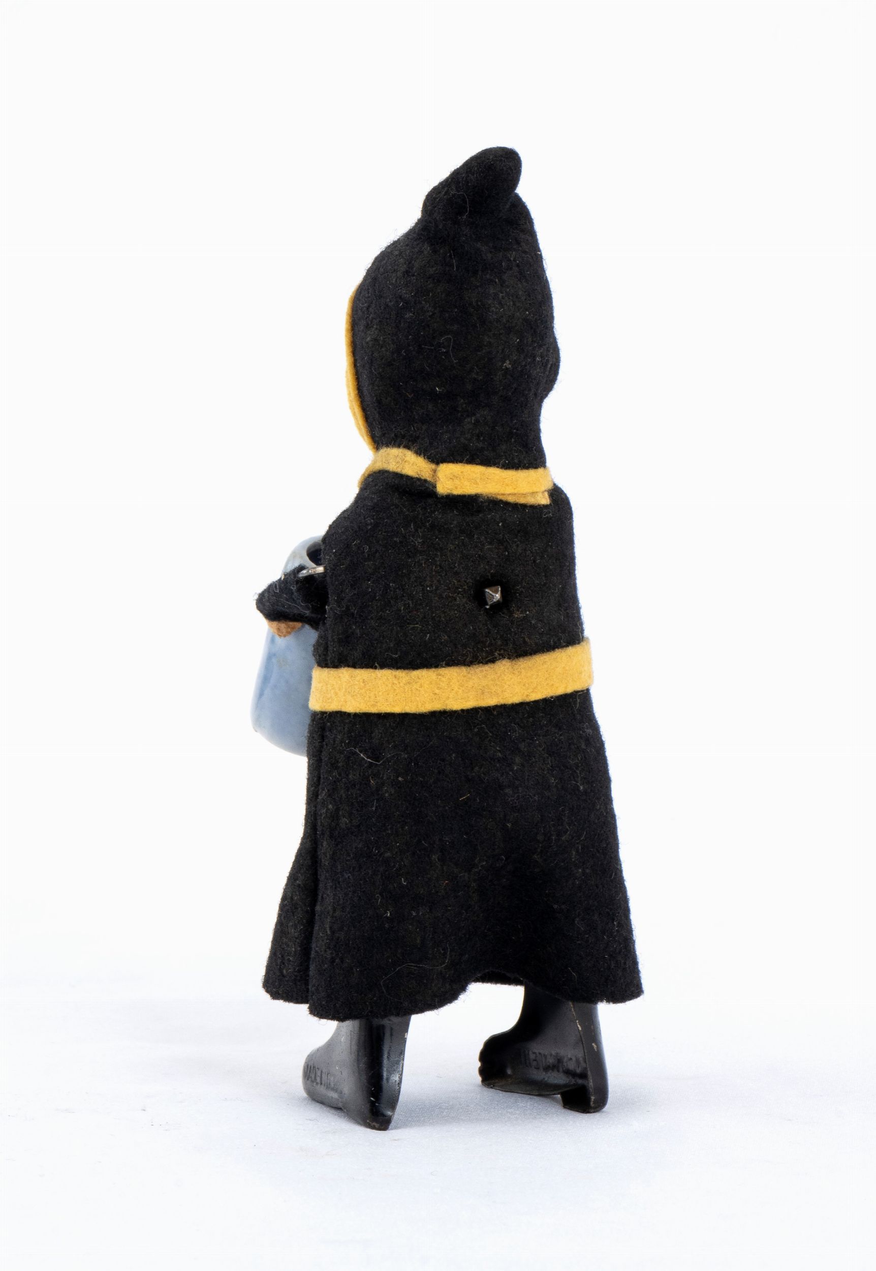 Personaggio della SCHUCO, Germany, frate bevitore con saio nero e giallo, boccale in ceramica dipinta blu, meccanismo con carica a molla. Anni '930. Marcato sui piedi
