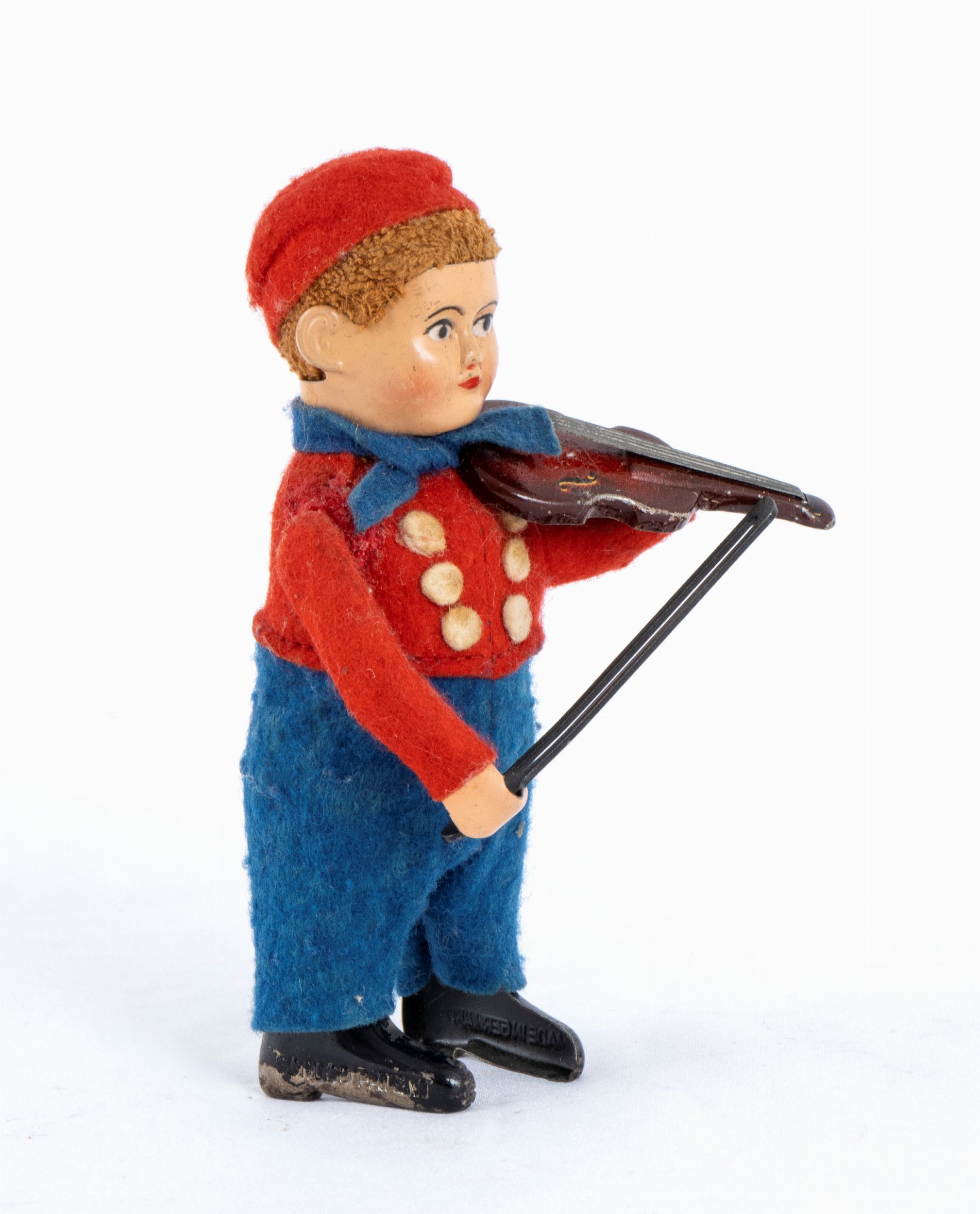 Personaggio della SCHUCO, Germany, personaggio in costume (Bavarese ? Ungherese ?) suonatore di violino, meccanismo con carica a molla. Anni '930. Marcato sui piedi