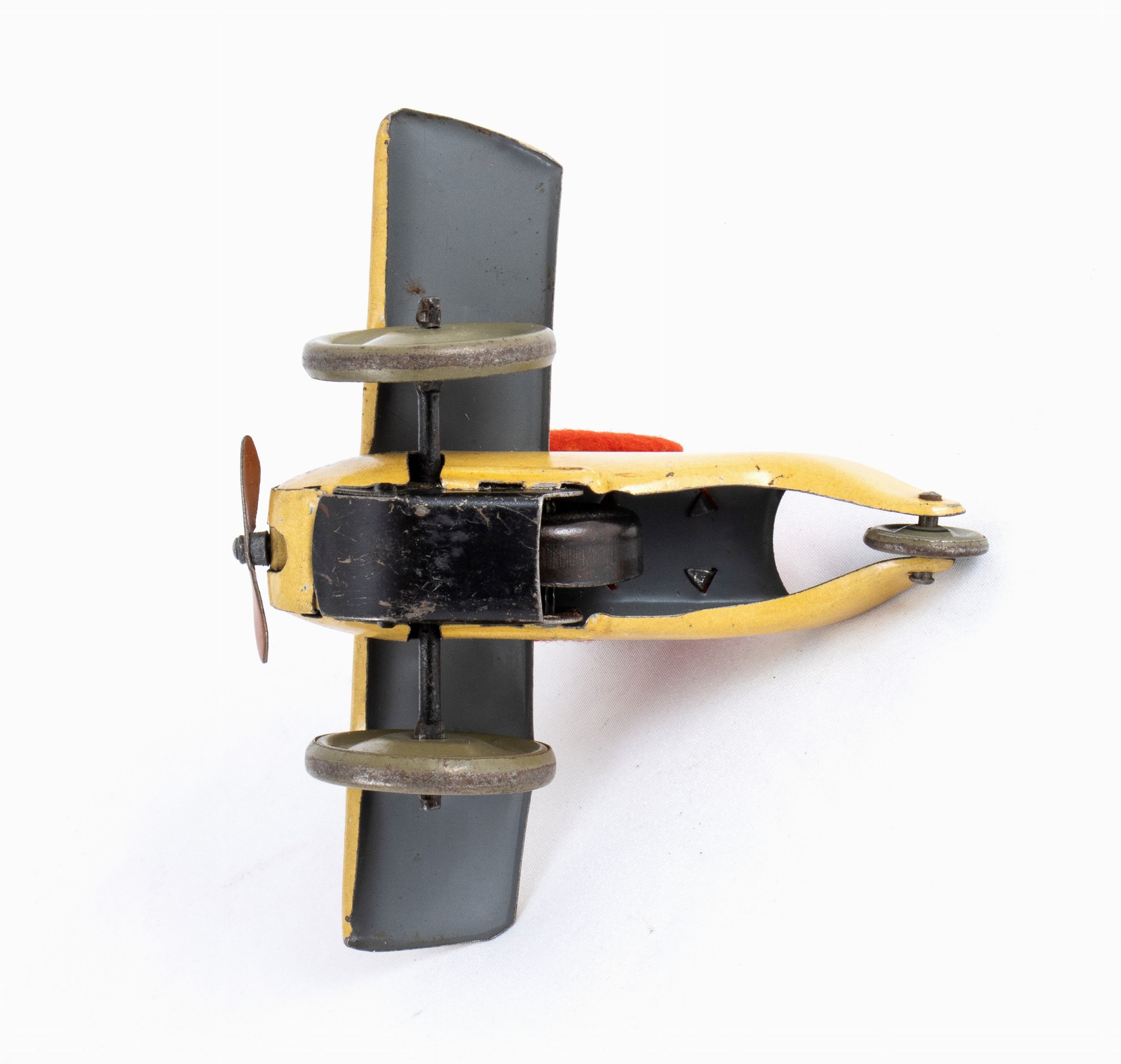 cm.10 Aereo in latta litografata SPIRIT OF ST.LOUIS , commemorativo della impresa NEW YORK-PARIS di Lindberg. Sull'ala è litografata la corretta matricola N-X-211. Marcato con logo e SCHUCO TRADE MARKE. Con pilota originale a raffigurare Charles Lindberg. Meccanismo di carica a molla., 1927