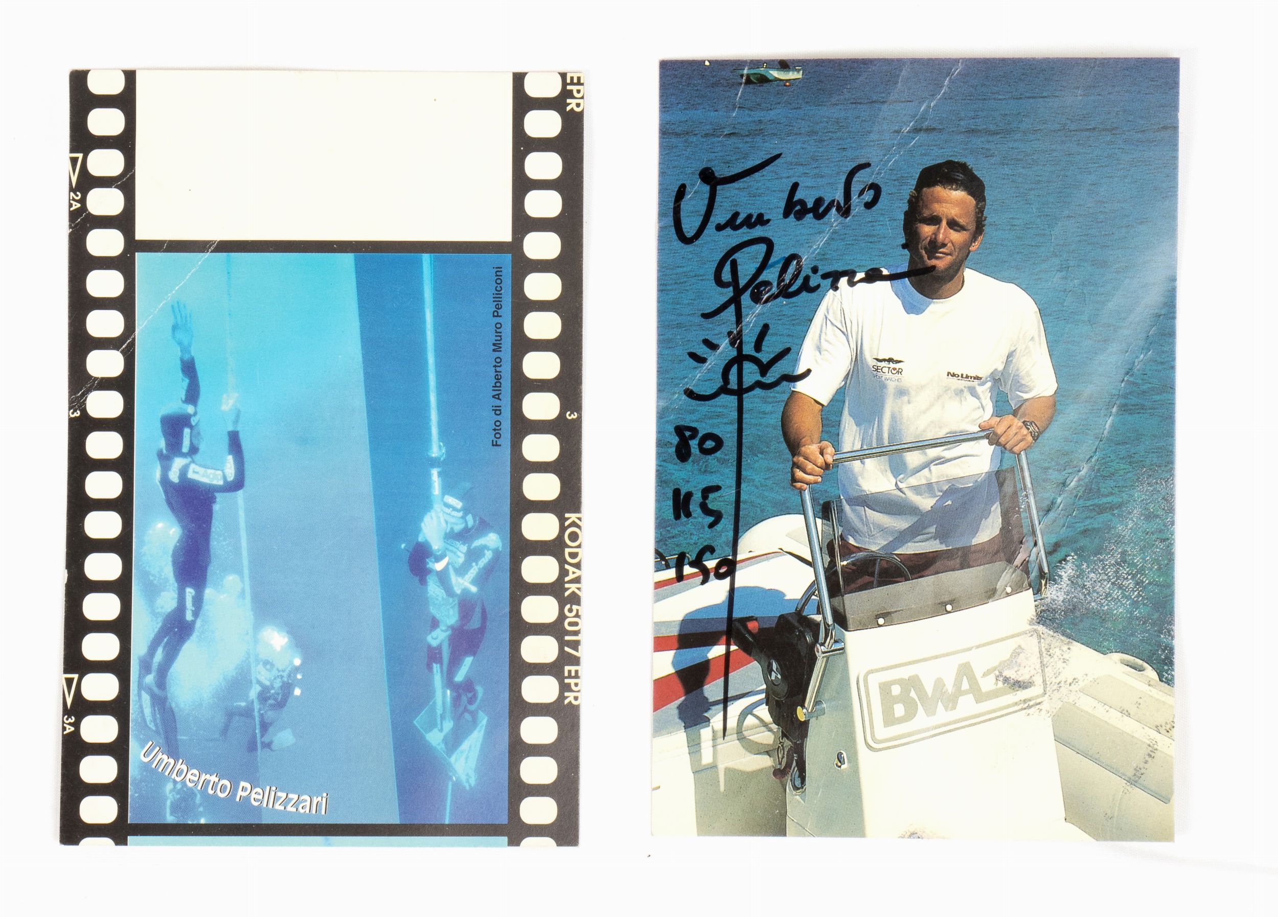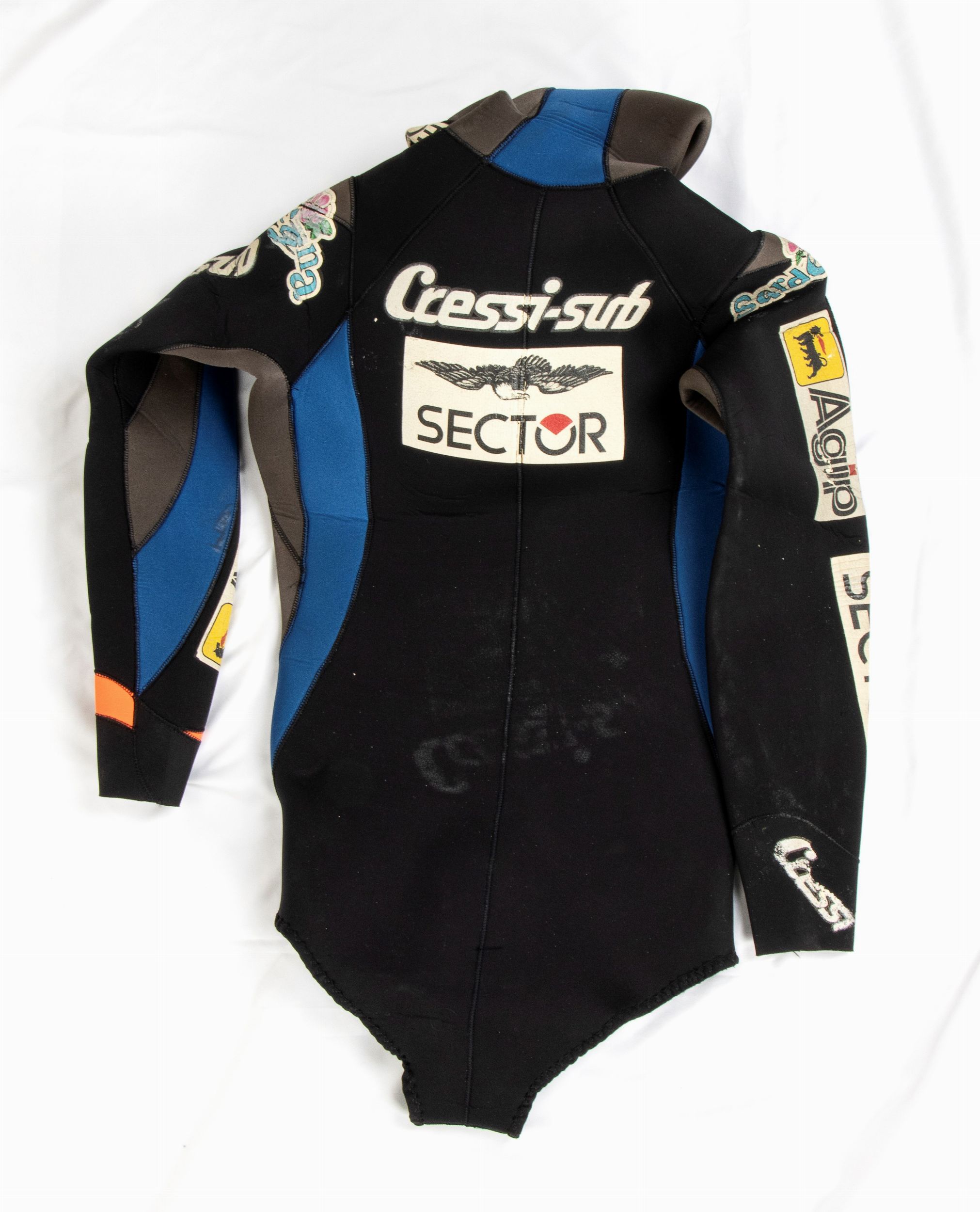 Equipaggiamento originale appartenuto a Umberto Pellizzari usato nel 2000 durante la realizzazione del film IMAX (2D) dal titolo OceanMen insieme al rivale Pipin Ferreras. Muta Cressi Sub composta da giacca e pantaloni con sponsor CRESSI, Agip, Sector, firmata con dedica ed autografo originali scritti di pugno con pennarello nero UMBERTO PELLIZZARI 80 115 150 ad indicare le profondità raggiunte nei records. In aggiunta un paio di occhiali ed un profondimetro MARES usati sempre da Pellizzari, con una foto cartolina autografata in originale UMBERTO PELLIZZARI 80 115 150. Materiale usato, in ottime condizioni.